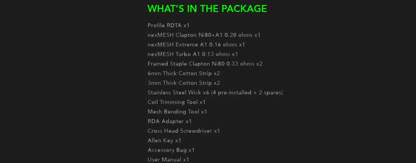 Mit dem Kauf des Profils RDTA erhalten Sie eine nexMesh Clapton Ni80 + A1 0,2 Ohm Spule, eine nexMesh Extreme A1 0,16 Ohm Spule, eine nexMesh Turbo A1 0,13 Ohm Spule und 2 gerahmte stabile Clapton Ni80 0,33 Ohm Spulen. Weitere Bestandteile des Pakets sind sechs Dochte aus rostfreiem Stahl, ein Werkzeug zum Trimmen von Spulen, ein Werkzeug zum Biegen von Maschen, ein RDA-Adapter, ein Kreuzschlitzschraubendreher, ein Inbusschlüssel, eine Tasche mit Zubehör und ein Handbuch.