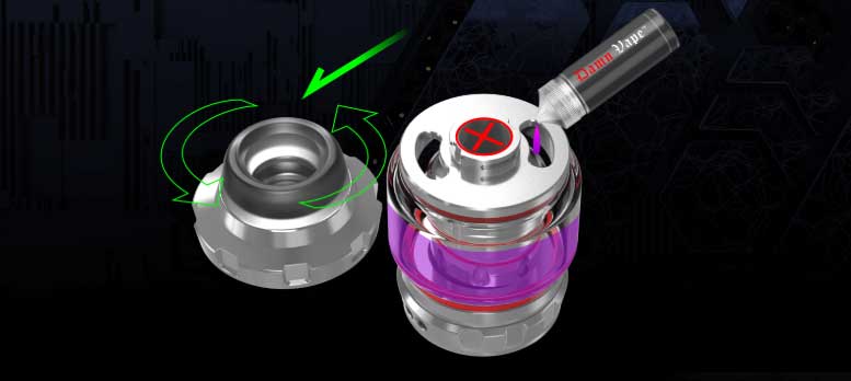 Mit dem Wotan erhalten Sie zwei Glasröhren, von denen eine bis zu 5 ml E-Liquid und die andere 2 ml aufnehmen kann. Um Saft in den Vorratsbehälter zu geben, drehen Sie einfach die obere Kappe und entfernen Sie sie, um zwei große Saftöffnungen freizulegen.