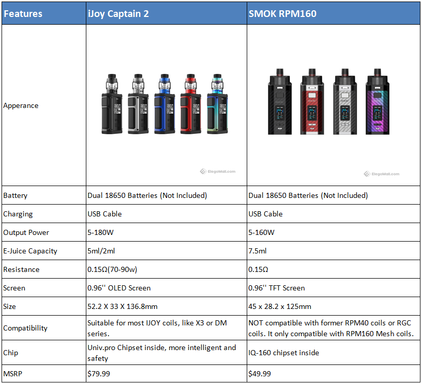 Wie bereits erwähnt, werden das Captain 2-Kit und das RPM160-Kit alle mit einer doppelten 18650-Batterie betrieben, jedoch mit unterschiedlicher Ausgangsleistung. Als Box-Kit ist Captain 2 mit einer maximalen Ausgangsleistung von 180 W leistungsstärker.
