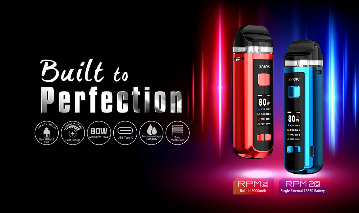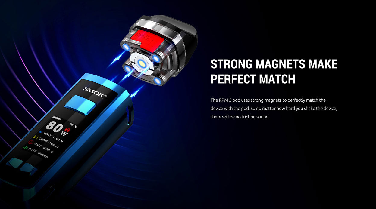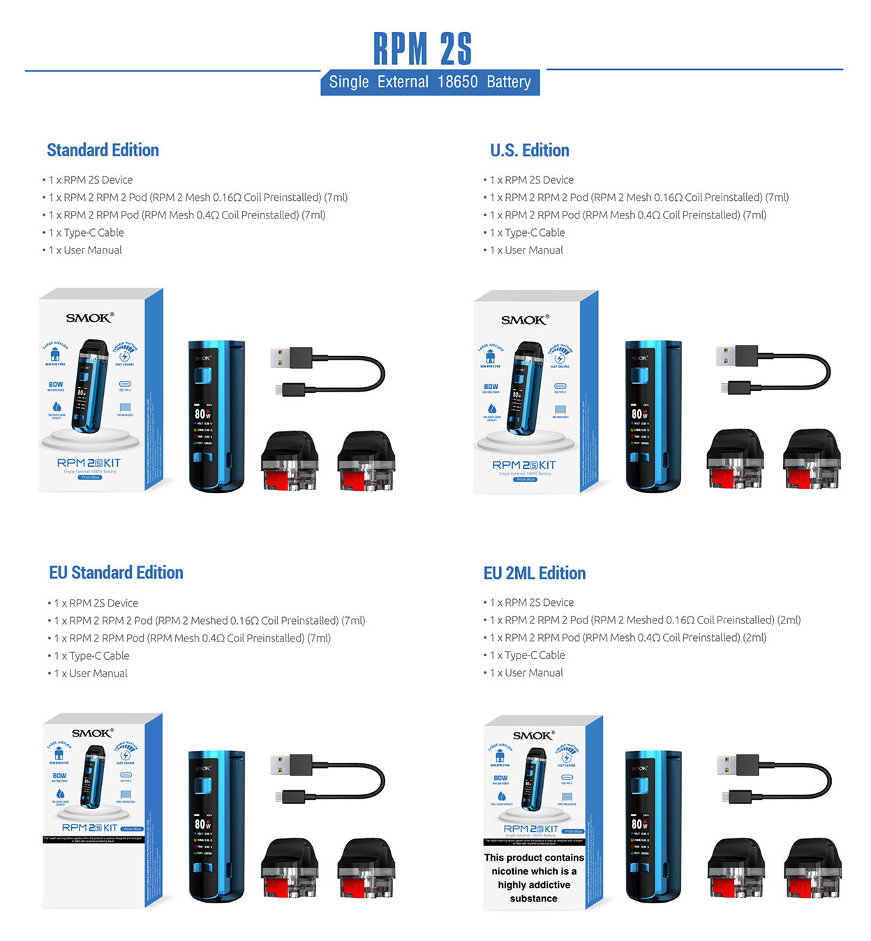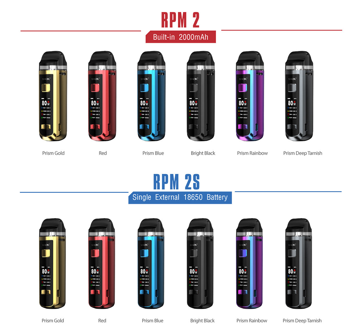 Das SMOK RPM 2S Kit ist die austauschbare 18650 Batterieversion des RPM 2 Pod Mod Kits. Das SMOK RPM 2S Kit und das SMOK RPM 2 Kit haben die gleiche Leistung und das gleiche Erscheinungsbild. Der einzige große Unterschied ist der Batterietyp. Aufgrund der externen Batterie ist die Drehzahl 2S höher, aber die Breite und Dicke sind gleich. Das RPM 2 Kit verfügt über eine integrierte Kapazität von 2000 mAh, während RPM 2S einen externen 18650 Akku verwendet, um das gesamte Gerät dauerhaft mit Strom zu versorgen. Beide haben eine Leistung von bis zu 80 Watt. Für den Austausch des Füll-Pods verwendet RPM 2S denselben Pod wie RPM 2, und es gibt zwei Typen: RPM 2 RPM 2 Pod und RPM 2 RPM Pod. RPM 2 RPM 2 Pod hat eine riesige Kapazität von 7 ml und wird mit einer vorinstallierten Mesh 0,16 ohm Coil geliefert. Das große Mundstück ermöglicht mehr Luftstrom, perfekt für direktes Dämpfen der Lunge. Der RPM 2 RPM Pod mit einem riesigen Fassungsvermögen von 7 ml, in dem sich eine 0,4 ohm Mesh Coil mit RPM-Mesh befindet, eignet sich perfekt für das Verdampfen von Mund zu Lunge. Die RPM 2 Mesh Coils sind für dichten Dampf und intensiven Geschmack ausgelegt, während die RPM Mesh Coils für sanfte Kehlschläge und einen zufriedenstellenden Geschmack sorgen. Darüber hinaus können Sie mit dem RPM 2 Pod mit sichtbarem Fenster für den E-Flüssigkeitsstand jederzeit die verbleibende Saftkapazität überprüfen. Der RPM 2-Pod verwendet leistungsstarke Magnete, damit der Pod perfekt zum Gerät passt.