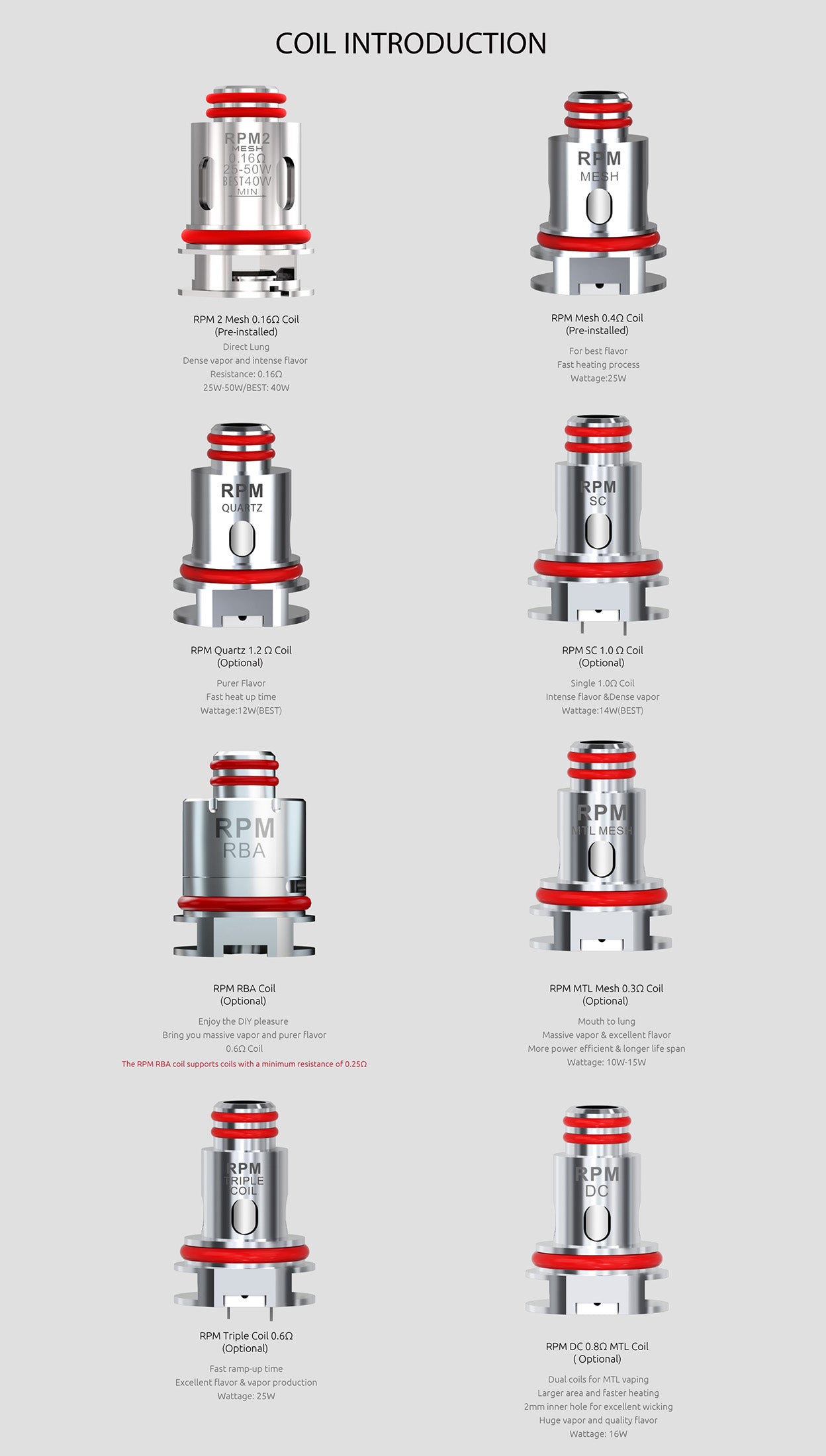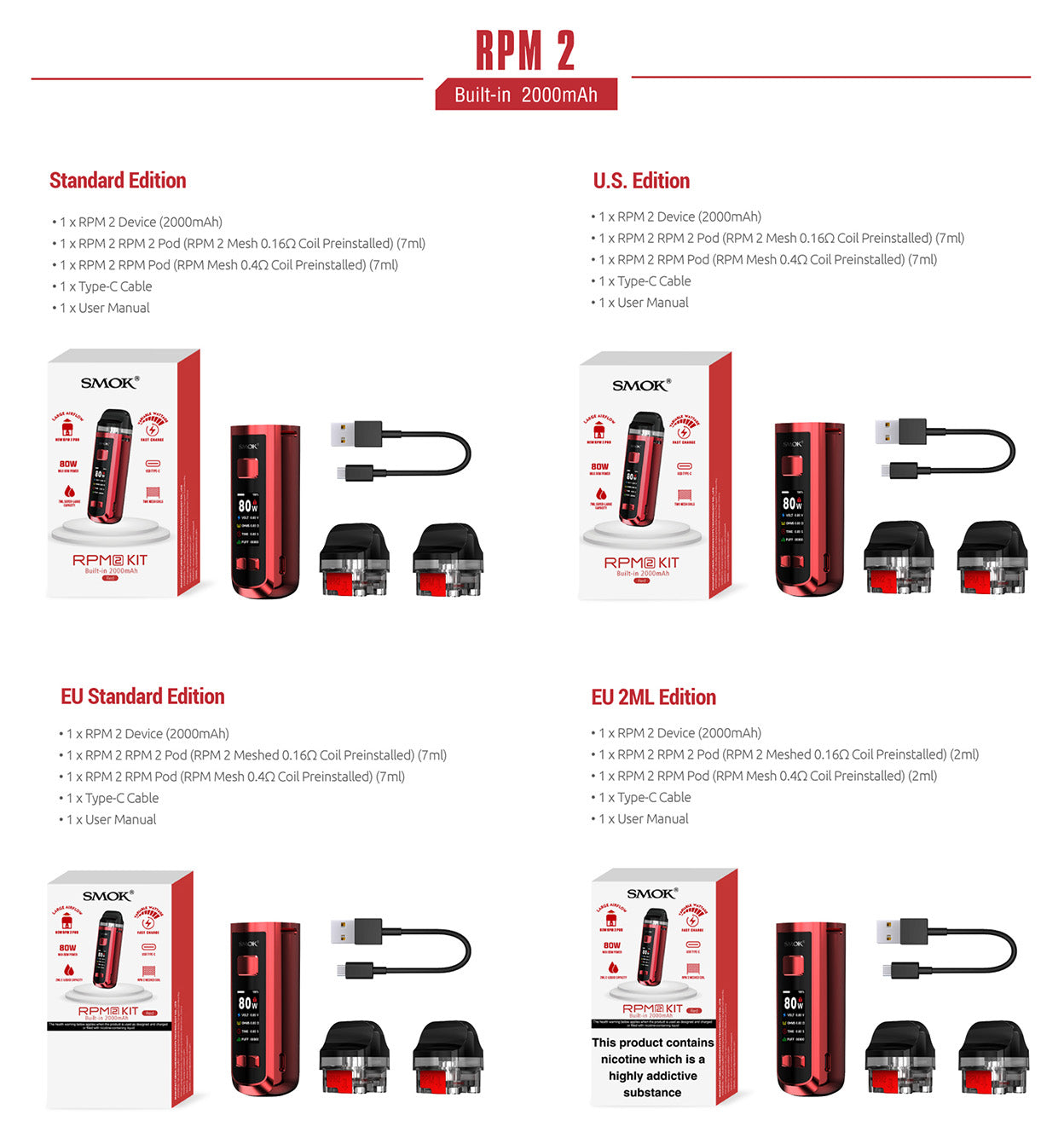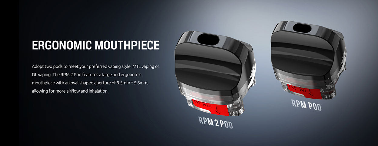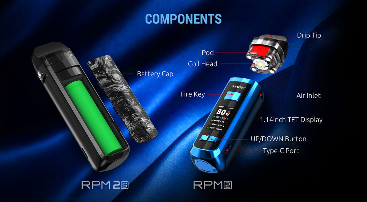 Das SMOK RPM 2S Kit ist die austauschbare 18650 Batterieversion des RPM 2 Pod Mod Kits. Das SMOK RPM 2S Kit und das SMOK RPM 2 Kit haben die gleiche Leistung und das gleiche Erscheinungsbild. Der einzige große Unterschied ist der Batterietyp. Aufgrund der externen Batterie ist die Drehzahl 2S höher, aber die Breite und Dicke sind gleich. Das RPM 2 Kit verfügt über eine integrierte Kapazität von 2000 mAh, während RPM 2S einen externen 18650 Akku verwendet, um das gesamte Gerät dauerhaft mit Strom zu versorgen. Beide haben eine Leistung von bis zu 80 Watt. Für den Austausch des Füll-Pods verwendet RPM 2S denselben Pod wie RPM 2, und es gibt zwei Typen: RPM 2 RPM 2 Pod und RPM 2 RPM Pod. RPM 2 RPM 2 Pod hat eine riesige Kapazität von 7 ml und wird mit einer vorinstallierten Mesh 0,16 ohm Coil geliefert. Das große Mundstück ermöglicht mehr Luftstrom, perfekt für direktes Dämpfen der Lunge. Der RPM 2 RPM Pod mit einem riesigen Fassungsvermögen von 7 ml, in dem sich eine 0,4 ohm Mesh Coil mit RPM-Mesh befindet, eignet sich perfekt für das Verdampfen von Mund zu Lunge. Die RPM 2 Mesh Coils sind für dichten Dampf und intensiven Geschmack ausgelegt, während die RPM Mesh Coils für sanfte Kehlschläge und einen zufriedenstellenden Geschmack sorgen. Darüber hinaus können Sie mit dem RPM 2 Pod mit sichtbarem Fenster für den E-Flüssigkeitsstand jederzeit die verbleibende Saftkapazität überprüfen. Der RPM 2-Pod verwendet leistungsstarke Magnete, damit der Pod perfekt zum Gerät passt.