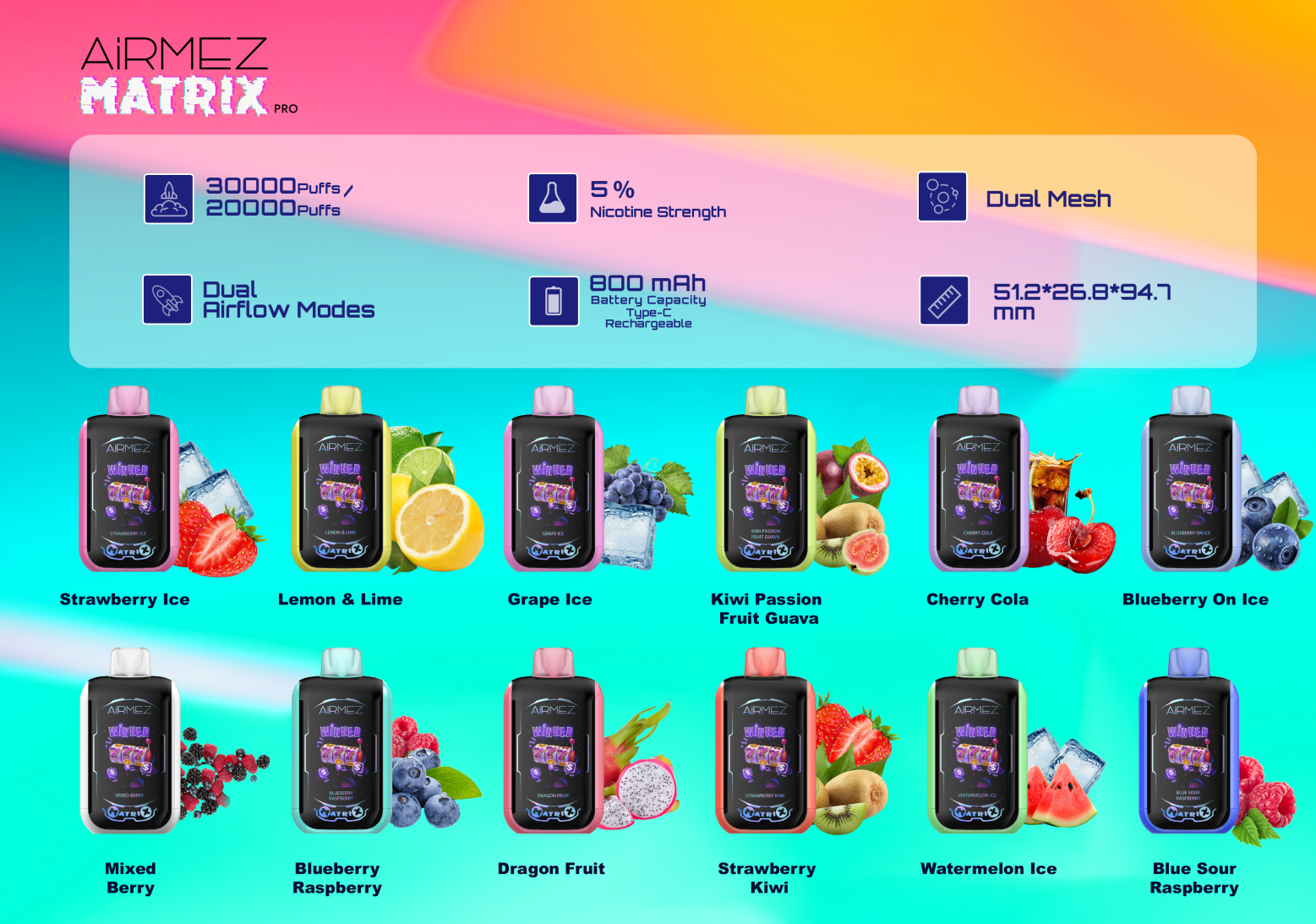 Die Airmez Matrix 25000 Puffs ist eine bahnbrechende Einweg-E-Zigarette, die fortschrittliche Technologie, erstklassige Leistung und interaktiven Spielspaß vereint. Entwickelt für Dampfer, die mehr als nur Geschmack erwarten, bietet die Matrix 30000 als weltweit erste E-Zigarette das Lucky Room Gameplay und macht so jeden Zug zu einem einzigartigen Erlebnis.