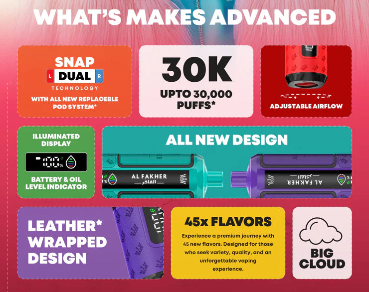 Der AL Fakher Hypermax 30K ist ein einfacher, aber hocheffizienter Einweg Vape. Dieses Gerät wird mit zwei vorgefüllten Pods und zwei Nachfüllbehältern geliefert, sodass Sie sofort nach dem Auspacken mit dem Dampfen beginnen können. Es ist keine komplizierte Einrichtung oder laufende Wartung erforderlich; einfach den Pod einsetzen und inhalieren. Der Hypermax 30K wurde für Zuverlässigkeit und Benutzerfreundlichkeit entwickelt und verfügt über ein Dual-Pod-System, mit dem Sie zwei verschiedene Geschmacksrichtungen mitnehmen und jederzeit zwischen ihnen wechseln können. Der Al Fakher 30K Hypermax ist für eine lange Nutzungsdauer konzipiert und bietet bis zu 30.000 Züge mit seinem Dual-Pod- und Nachfüllbehälter-System. Mit einem sanften Mouth-to-Lung (MTL)-Zug, fortschrittlicher Mesh-Coil-Technologie und einer zufriedenstellenden 6-mg-Formel liefert jeder Zug ein reichhaltiges Aroma und einen sanften Throat Hit. Das Gerät ist außerdem mit einem eingebauten Akku und USB-C-Schnellladefunktion ausgestattet, was minimale Ausfallzeiten und maximalen Komfort gewährleistet.