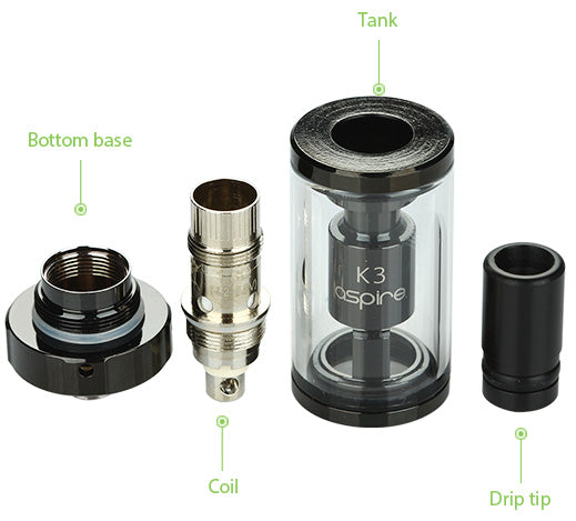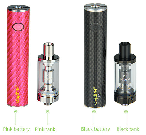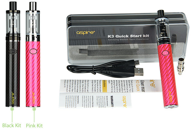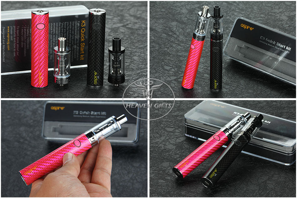 Das Aspire K3 Schnellstart Kit bringt Ihnen eine wirtschaftliche und komfortable Alternative, die Ihnen ein Open Source Tank und ein Batteriesystem bietet, das wiederverwendbar und wiederaufladbar ist und das Beste aus dem K3 Tank ist nachfüllbar. So sind Sie nie auf Geschmack beschränkt. Wie abgebildet, eine Schwarz Batterie mit dem Schwarz Tank und die Rosa Batterie mit dem Silber Tank. Die Zerberstäuber 'Kapazität ist 2,0ml und die Coil hat einen Widerund von 1,8 Ohm, was dir ein besseres Vaping Erlebnis bringt. Das K3 Kit enthält die k3Batterie (1200mAh), einen K3 Panzer, einen Extra 1,8 Ohm Coil Ersatz, ein Micro USB Kabel und eine Geschenkbox mit Anti-Fake-Label.