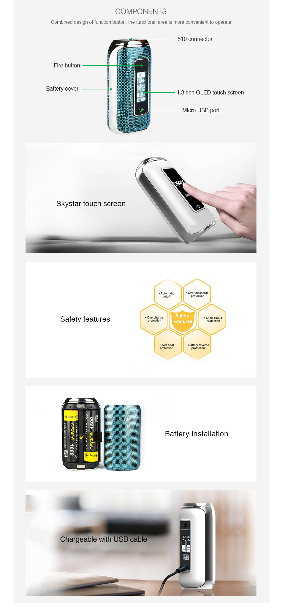 Aspire SkyStar Revvo 210W Berührungsempfindlicher Bildschirm Box Mod Akkuträger wird von zwei 18650 Batterien angetrieben und erreicht eine maximale Leistung von 210W für großartige Vaping-Erfahrung. SkyStar Revvo Mod wird mit einer Feuer-Taste und einem großen 1,3-Zoll-Touchscreen-Bildschirm geliefert, mit dem Sie das Einstellungsmenü ausrufen können wenn Sie zweimal nach unten wischen und Watt-Menü ausrufen können wenn Sie zweimal nach Oben wischen. SkyStar Revvo Touch Screen Mod unterstützt viele Ausgabemodi: VW, VV, BYPASS, TC und CPS, die Ihnen verschiedene Dampferfahrungen bieten.