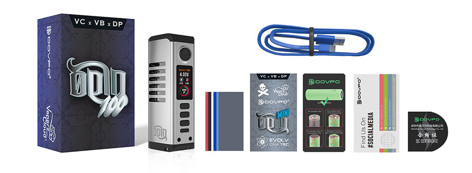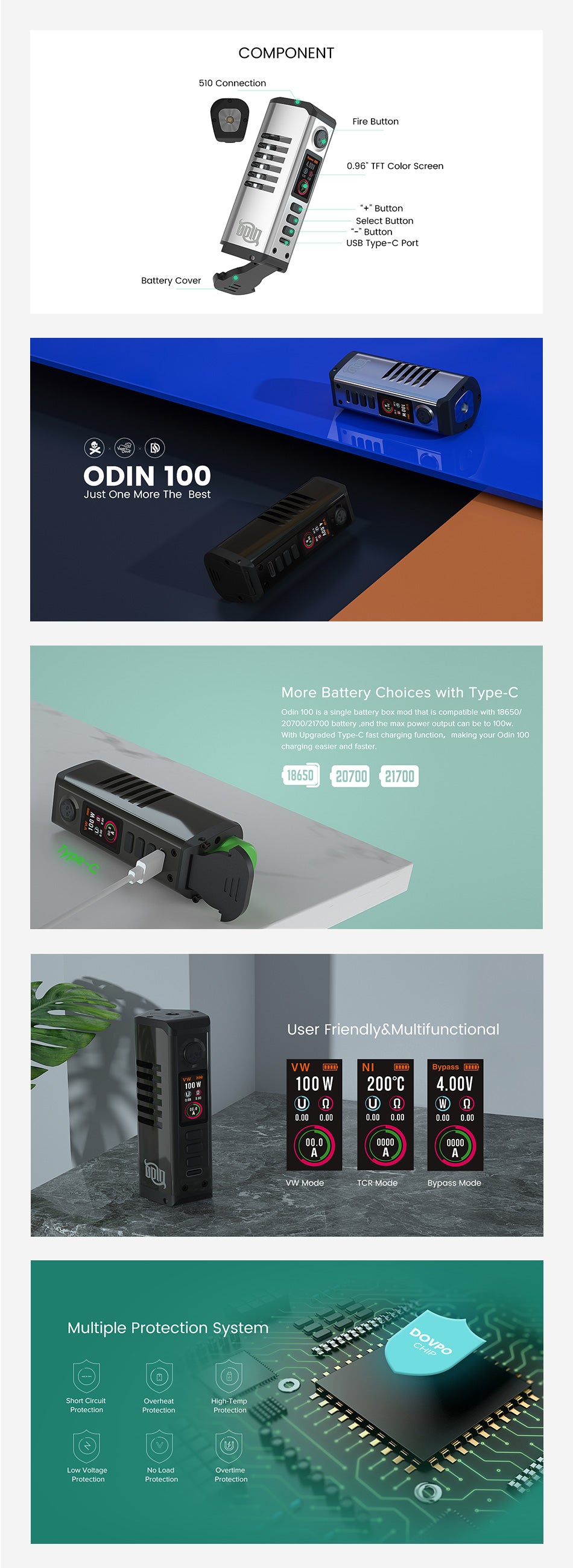 Der Odin 100 VW Vape Box Mod ist ein neues Mitglied der Odin Serie und arbeitet auch mit Vaping Bogan, Vaperz Cloud und Dovpo zusammen. Das schlanke, geregelte Single 21700 Gerät ist auch mit 18650/20700 Zellen kompatibel. Der Dovpo Odin 100 verwendet den neuesten Dovpo Chip für eine geschmacksorientierte und stabile Leistung. In Dovpo Odin 100 wird eine aktualisierte Vollfarb-Benutzeroberfläche verwendet. Alle Ihre Vorgänge, einschließlich Leistungsanpassung, Auswahl des BYPASS Modus oder Einstellung des TCR-Modus, werden auf dem 0,96 Zoll-Display deutlich angezeigt. Das mittlere 510 Gewinde bietet Platz für Tanks mit 28 mm Durchmesser.