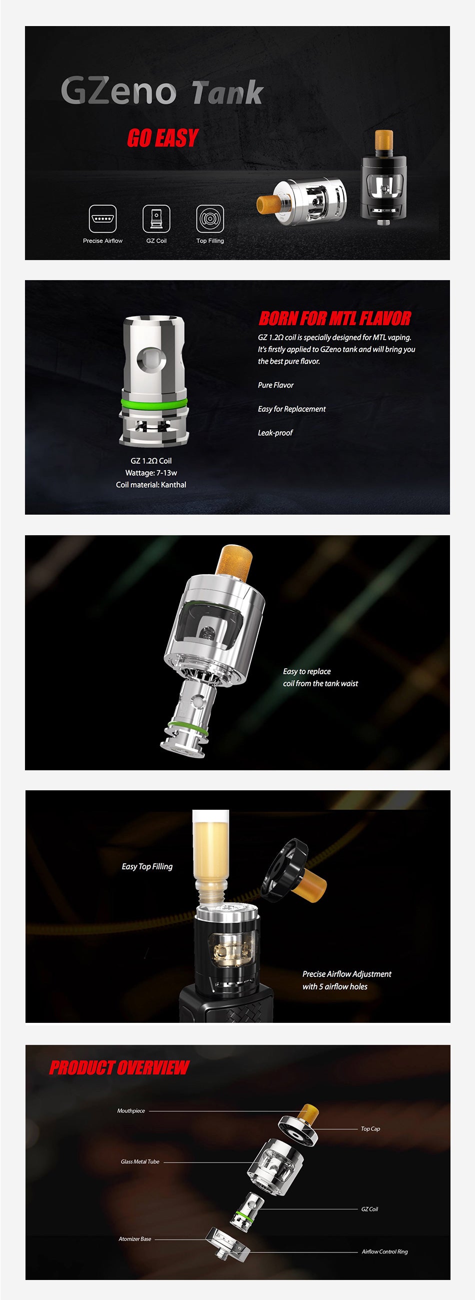 Eleaf GZeno Tank Verdampfer hat 3ml E-Saft Kapazität und wird mit einer GZ 1,2ohm Coil für MTL vape Verdampfen geliefert. Das schlanke Mundstück und der eingeschränkte Luftstrom am Boden helfen Ihnen, wunderbare vape von Mund zu Lunge zu verdampfen. Sie verfügt über ein praktisches oberes Füllsystem und einen einfachen Austausch der Coils. Der GZeno Tank ist mit 5 Luftstromlöchern ausgestattet, die Ihnen eine präzise Einstellung des Luftstroms ermöglichen.