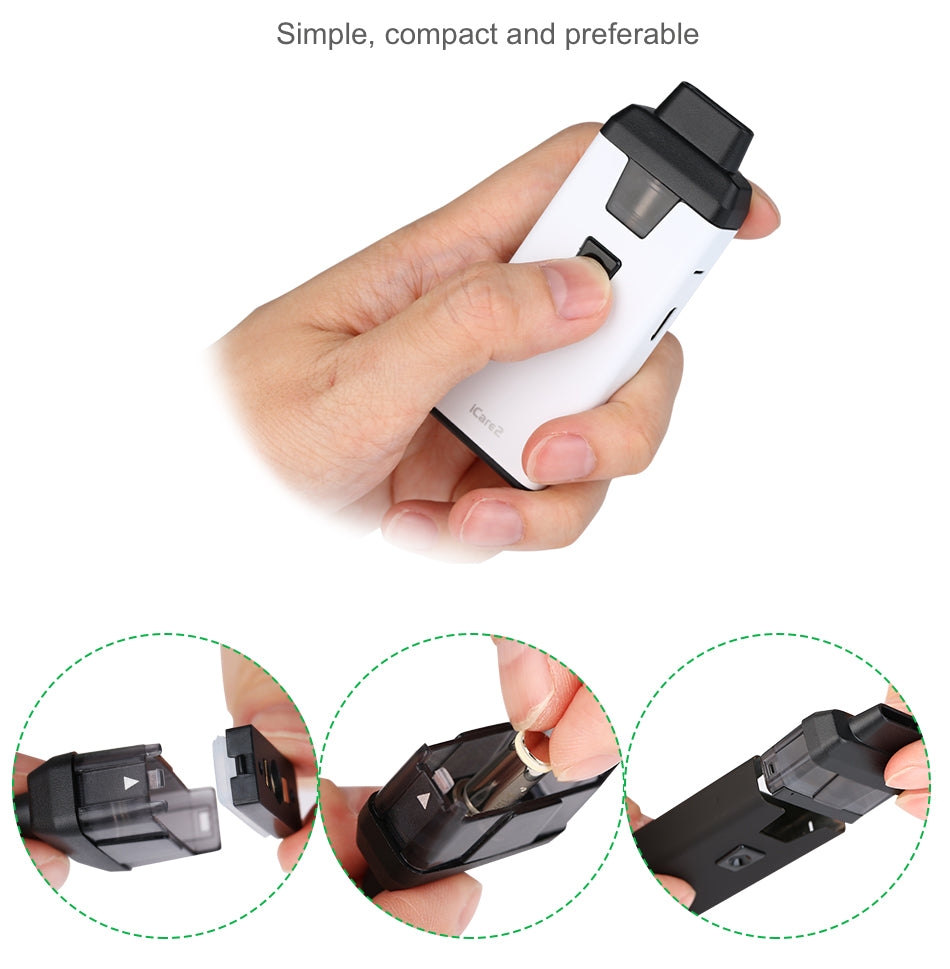 Hier kommt Eleaf iCare 2 Starter Kit Starterset , Es ist eine aktualisierte Version von iCare. Es wird mit einer kompakten Größe gelifert, verfügt über eine exquisite Gummi-Lackierung, Inklusive einer internen 650mAh Batterie und einem leicht zu reinigenden 2ml Tank mit Top Fill Lösung. Die maximale Ausgangsleistung kann bis zu 15 Watt betragen. Der Tank nutzt neue IC 1,3 Ohm Verdampferköpfe für ein tolles MTL Vaping mit verbessertem Geschmack. Erhältlich in 6 Farben.