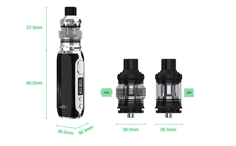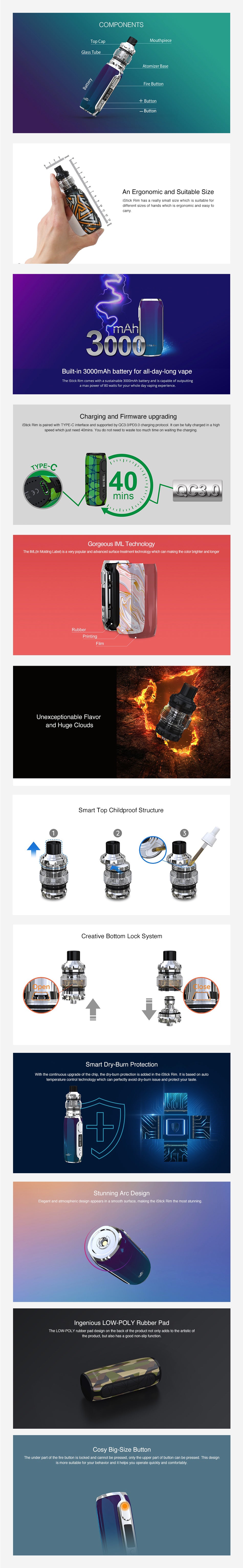 Das Eleaf iStick Rim Kit ist ein neues kompaktes Gerät der iStick Serie, das aus dem iStick Rim Mod und dem Melo 5 Atomizer besteht. Durch den eingebauten 3000 mAh Akku können bis zu 80W abgegeben werden, wobei ein übergroßer Zündknopf und ein großer LED Bildschirm verwendet werden. Für das Aufladen lassen sich natürlich Typ C und QC 3,0, die nur 40 Minuten benötigen, vollständig aufladen. Der Melo 5 Atomizer kann bis zu 4 ml iquid aufnehmen und wird durch neuartige EC Spulen unterstützt, die Ihnen einen unverbrannten Geschmack verleihen, sicher und dauerhaft dampfen. Es verwendet ein Top Fill Design sowie ein iquid Lock System für die Sicherheit von Kindern. Schließlich schützen die einzigartigen Silikonringe den Verdampfer bis zu einem gewissen Grad vor Bruch. 6 Farben zur Auswahl.