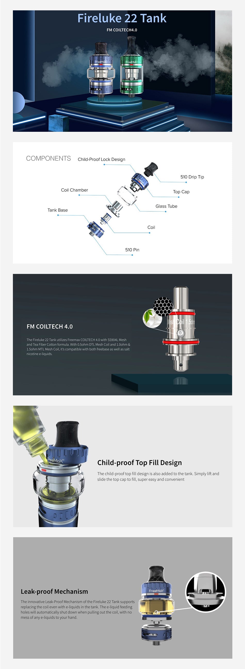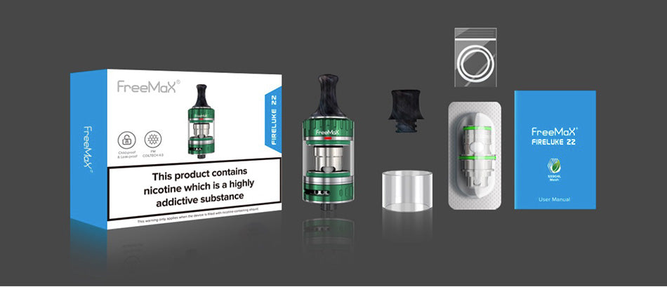 Der Freemax Fireluke 22 Tank Verdampfer wurde gegenüber dem Fireluke 2 Tank der vorherigen Generation aufgerüstet, was sich im Füll-und Auslaufsicherungsmechanismus widerspiegelt. Der Freemax Fireluke 22 Tank hat einen Durchmesser von 22 mm. Der Freemax Fireluke 22 Tank wird mit einem Bulb Ersatzglas Fassungsvermögen von 3,5 ml und einem Gerade Ersatzglas Kapazität von 2ml zur Auswahl geliefert. Der Freemax Fireluke 22 Tank verfügt über ein kindersicheres Top-Fill-Design zum einfachen Nachfüllen. Der auslaufsichere Mechanismus sorgt auch für einen bequemen Dampf. Der Freemax Fireluke 22 Tank ist mit 0,5 Ohm DTL Mesh Coil und 1,0 Ohm & 1,5 Ohm MTL Mesh Coil kompatibel und eignet sich daher sowohl für Freebase- als auch für Salz-NK-iquids für DTL- und MTL-Verdampfen-Anforderungen.