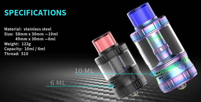 Der G-Taste Aries RTA Verdampfer aus Edelstahl mit 510 Gewindeverbindung ist ein 30mm RTA Verdampfer mit einem großen Baudeck für den Bau von Doppel- oder Dreifachspulen. Es handelt sich um einen Edelstahlkörper-RTA mit exquisitem Aussehen. Der Aries RTA kann eine große Saftkapazität von 6,0 ml und 10,0 ml (mit Ersatz-Blasenglas) aufnehmen. Mit 30 mm Durchmesser und 10 ml Kapazität zur Unterstützung eines Langzeitdampfens, im Lieferumfang gibt es ein 6 ml Ersatzglas. G-TASTE Aries RTA 30 verwendet ein einstellbares seitliches Luftstromsystem, um eine 12-stufige Luftstromregelung für große Wolken und einen weichen Geschmack zu bieten. Aries RTA unterstützt das einfache Bauen von Doppel- und Dreifachspulen. Aries 30 verfügt auch über ein Top-Filling-Design ohne Leckage.