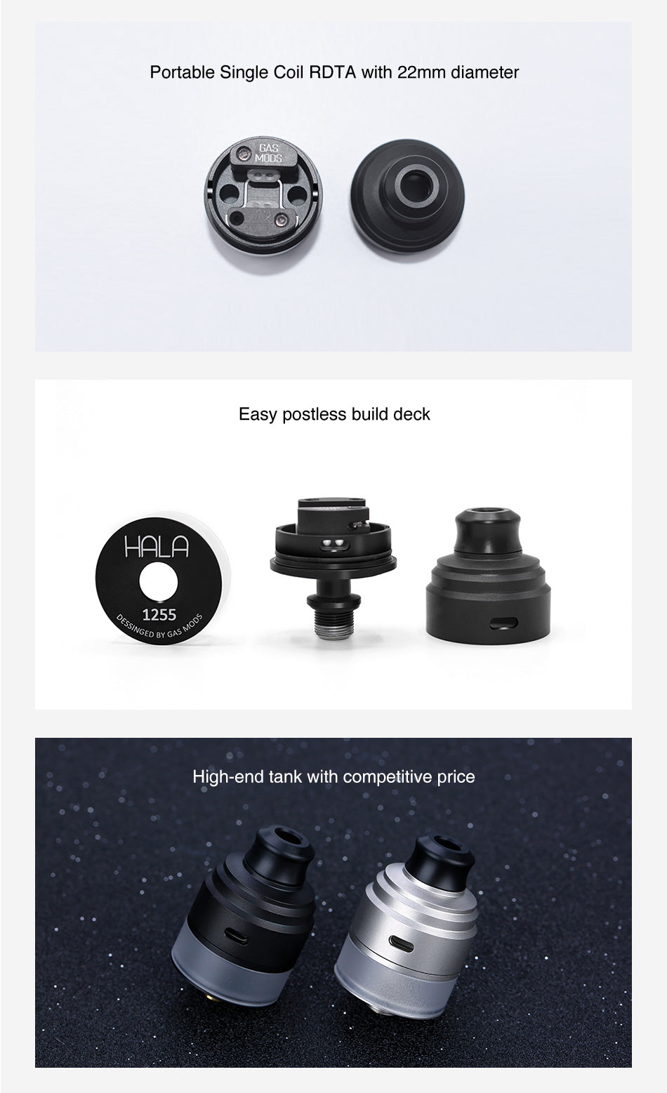 GAS Mods HALA RDTA besteht aus lebensmittelechtem SS304 mit 22mm Durchmesser und 2ml Inhalt. Hala RDTA ist das einzigartige Postless Build Deck mit austauschbarem Zubehör für die Luftstromregelung. Es unterstützt den einfachen Single-Coil-Bau und sorgt für einen fantastischen Dampf. Und Hala ist kompatibel mit Squonk Mods von BF Pin. Gute Wahl für RBA Liebhaber.
