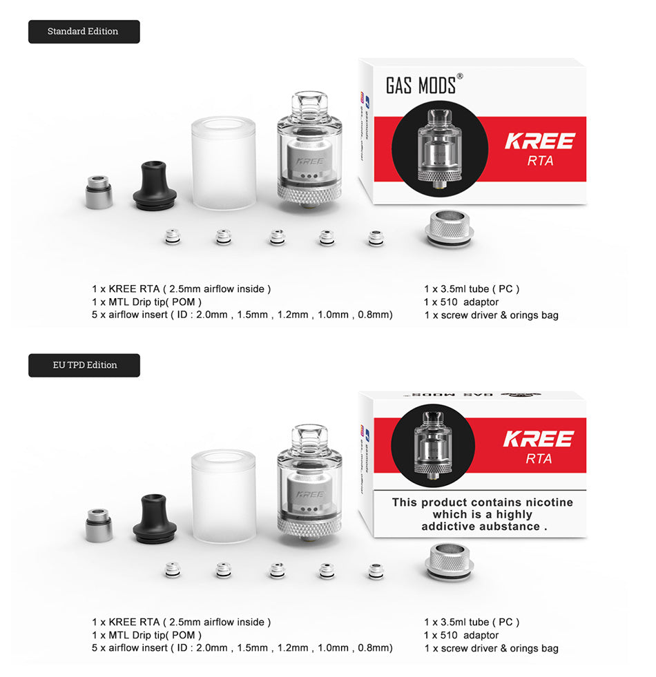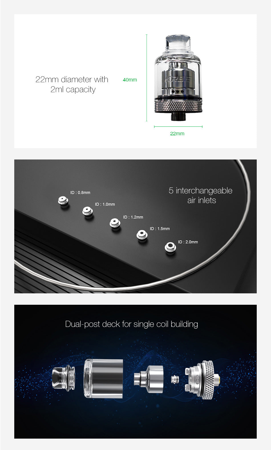 Gas Mods Kree RTA ist ein Selbstwickel-Tank-Verdampfer mit einem Single-Coil-Layout mit zwei Postbuild-Decks. Der Gas Mods Kree RTA wird mit einer 2,0ml Glasröhre und einer PC-Röhre geliefert, die 3,5ml fasst. Es wird mit verschiedenen austauschbaren Luftstromregelungszubehörteilen geliefert, um Ihnen ein reichhaltiges Dampferlebnis zu bieten. Darüber hinaus wird der RTA mit 6 Luftstrom-Einsätzen (Innendurchmesser: 2,5mm, 2,0mm, 1,5mm, 1,2mm, 1,0mm, 0,8mm) geliefert, mit denen Sie verschiedene Luftstrom-Regler an Ihre Bedürfnisse anpassen können, um Ihr MTL-Dampferlebnis zu verbessern. Mit ACF-Löchern mit unterschiedlichem Durchmesser bietet der GAS MODS Kree RTA ein erstaunliches Dampferlebnis.