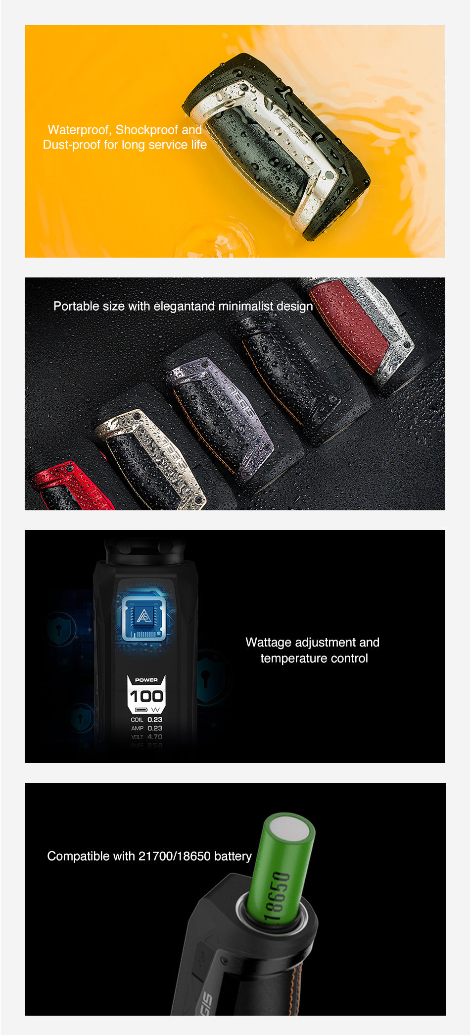Der Geekvape Aegis Max Mod aus Zink-Aluminium-Legierung, stark und schlagfest. Es ist derzeit das neueste IP-67-Gerät mit militärischer Architektur, das stoßfest, wasserdicht und staubdicht ist. Der Aegis Max Mod wird von einer einzigen 18650/21700 Batterie betrieben und kann eine maximale Ausgangsleistung von bis zu 100 W erzeugen. Sein interner AS-100-Chipsatz kann eine schnelle Startgeschwindigkeit realisieren, der Ausgangsbereich beträgt 5 W bis 100 W, der Widerstand beträgt nur 0,05 Ohm und er verfügt über eine Vielzahl von Ausgangsmodi, einschließlich VV, VW, VPC, Bypass, TC und TCR. Aegis Max verfügt außerdem über ein intuitives OLED-Display für eine übersichtliche Datenanzeige. Darüber hinaus verfügt Aegis Max Mod über erstklassige Sicherheitsfunktionen für eine komfortable und sichere Dampfumgebung.