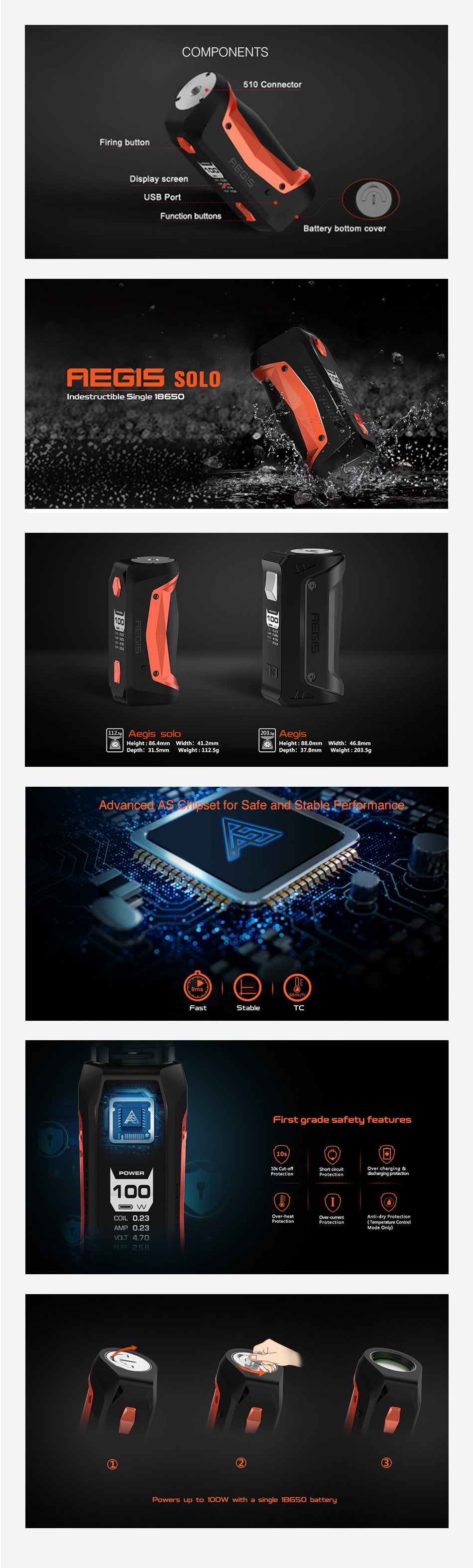 Geekvape Aegis Solo Mod wird von einem 18650 Hochleistungsakku angetrieben. Mit dem neuesten AS-Chipsatz kann dieser Mod bis zu 100 W mit 10 ms Schnellfeuer und verschiedenen Arbeitsmodi auslösen. Verglichen mit den vorherigen Produkten der Aegis-Serie von Geekvape, dem Aegis Solo, das die wasserdichten, stoßfesten und staubdichten Merkmale des vorherigen Aegis vereint, verfügt das Aegis Solo über ein kleineres und leichteres Chassis mit bemerkenswerter Haltbarkeit und einem angenehmen Handgefühl. Darüber hinaus gibt es einen 0,96-Zoll-LED-Bildschirm, der die Dampfen Daten klar anzeigt. Der Mod unterstützt auch das schnelle Aufladen über USB sowie mehrere Sicherheitsschutzfunktionen. 6 Farben stehen zur Auswahl.