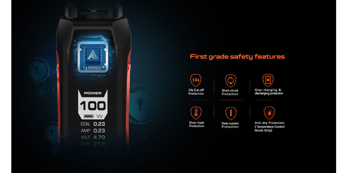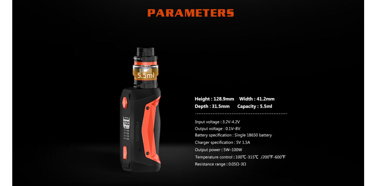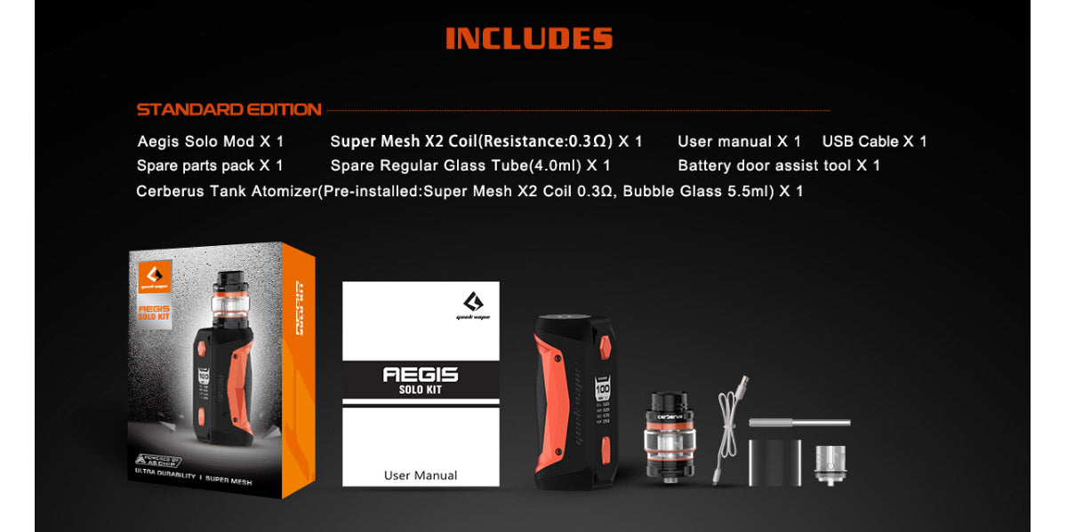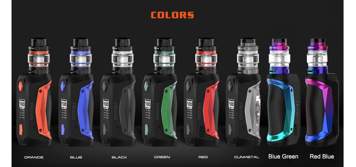 Das Geekvape Aegis Solo Kit besteht aus dem Aegis Solo Akkuträger und dem Cerberus Verdampfer. Der Akkuträger wird von einem 18650-Hochleistungsakku und dem neuesten AS-Chipsatz angetrieben und kann eine maximale Ausgangsleistung von 100 W mit 10 ms Schnellfeuergeschwindigkeit und verschiedenen Arbeitsmodi erzielen. Darüber hinaus gibt es eine 0,96 Zoll LED Anzeige, auf der die Dampfdaten klar dargestellt werden. Der Mod unterstützt auch das schnelle Aufladen über USB sowie mehrere Sicherheitsschutzfunktionen. Wie das Geekvape Aegis Mini Kit kann es auch Power / VPC / TC / TCR / Bypass Modi unterstützen und wasserdicht, staubdicht, stoßfest ist. Der Cerberus Verdampfer verfügt über eine große Kapazität von 5,5 ml, ein praktisches Füllsystem von oben und eine zweifach einstellbare untere Luftstromsteuerung. Und es kommt mit einer 0,3 Ohm Super Mesh X2-Spule mit einer Leistung von 30 bis 45 Watt, die Ihnen ein unglaubliches Dampferlebnis bietet. 6 Farben sind optional.