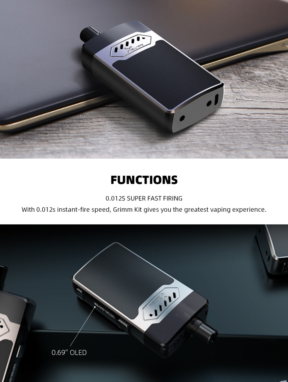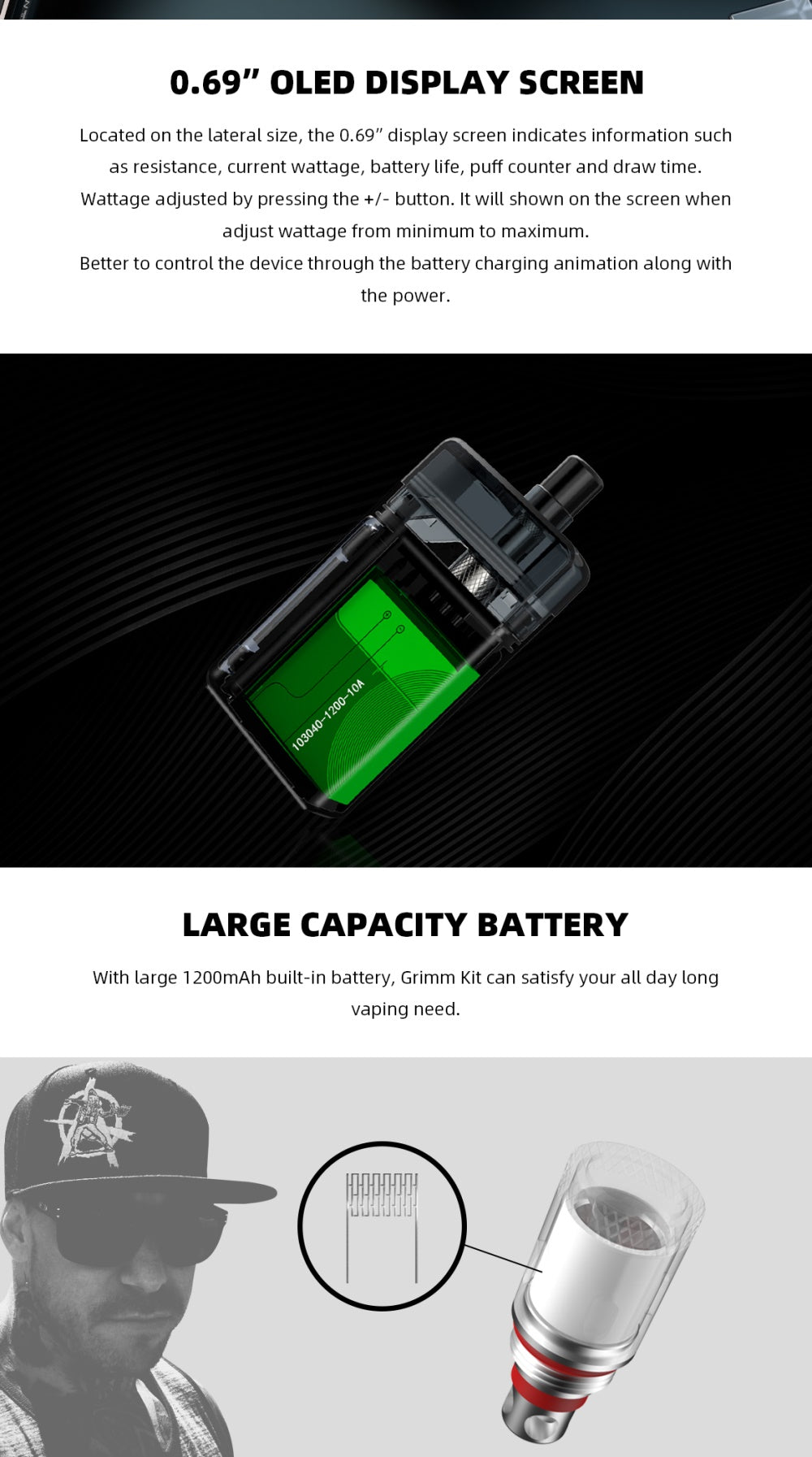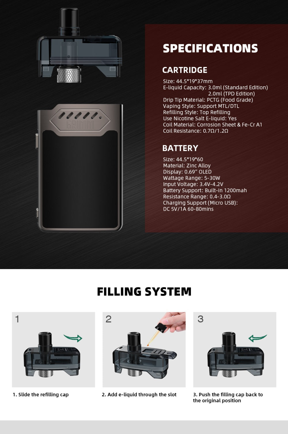 Hellvape Grimm Kit ist eine Zusammenarbeit zwischen Hellvape und Grimm Green und Ohm Boy. Angetrieben von einem internen 1200mAh Akku wird der Mod zwischen 5W und 30W abgeben. Ausgestattet mit einem hellen OLED-Display zeigt es die detaillierten Dampfdaten übersichtlich an und ist einfach zu bedienen. Das aus Zinklegierung und PCTG-Materialien hergestellte GRIMM Pod-System ist mäßig schlagfest und verhindert, dass Kratzer den Box-Mod beschädigen. Mit der nachfüllbaren 2ml Pod und der GRIMM Spulenserie, der 0,7Ohm Mesh Coil und der 1,2Ohm Normalspule wird Ihnen ein großartiges Dampferlebnis anbieten.