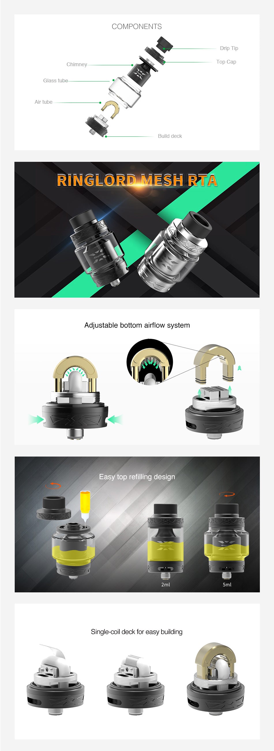 Der Hugsvape Ring Lord Mesh RTA Verdampfer mit 26 mm Durchmesser ist aus Edelstahl gefertigt und kann 5 ml E-Saft aufnehmen. Durch die Verwendung eines einzigartigen U-förmigen, vergoldeten Push Mesh Stil Drahtes kann er dank einer größeren Spulenkontaktfläche wirklich Geschmack hervorbringen. Darüber hinaus plus das einfache Befüllung von oben Design und das untere Luftstrom einstellbare System, der Ring Lord Mesh RTA Verdampfer ist wirklich ein anständiger Verdampfer für Anfänger und erfahrene Benutzer. Das einzigartige Deck ist sehr einfach zu konstruieren. 2 Farben zur Auswahl.