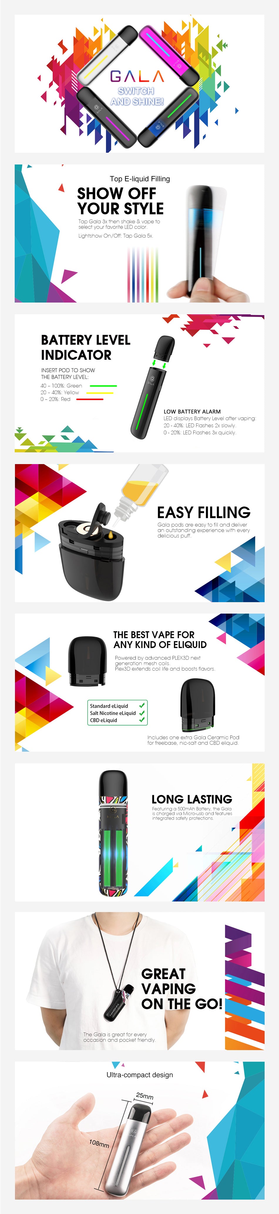Das Innokin GALA Kit ist ein neues Pod System mit einer einzigartigen Funktion. Mit einer leuchtenden LED erstrahlt die Gala in strahlendem Licht. Tippen Sie dreimal auf die Gala und wählen Sie durch Shake & Vape Ihre bevorzugte LED Farbe aus. Für den Fall, dass die LED Lichter etwas zu viel werden, hat die Gala auch einen Stealth Modus, um sie auszuschalten, und einen Lightshow Modus, wenn die LEDs nicht ausreichen und die gesamte Farbskala der Gala durchlaufen! Die Gala LED zeigt deutlich die aktuelle Akkuladung an, wenn der Akku aufgeladen werden muss. Die Gala ist außerdem mit einem 500 mAh Akku ausgestattet, der sich perfekt für jede Gelegenheit eignet und zudem taschenfreundlich ist. Der nachfüllbare Behälter kann bis zu 2 ml iquid aufnehmen. Die mitgelieferte 0,5 Ohm Plex3D Mesh Coil der nächsten Generation hält lange und steigert die Aromen. Außerdem können Sie einen zusätzlichen Pod mit einer vorinstallierten 0,8Ohm Keramikspule erhalten. Zusätzlich zu der einfachen Lösung zum Füllen des Bodens bieten die Pads ein herausragendes Erlebnis mit jedem köstlichen Zug.