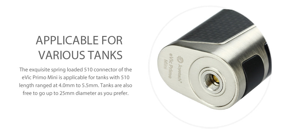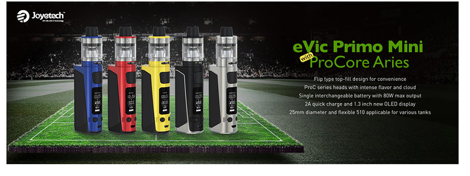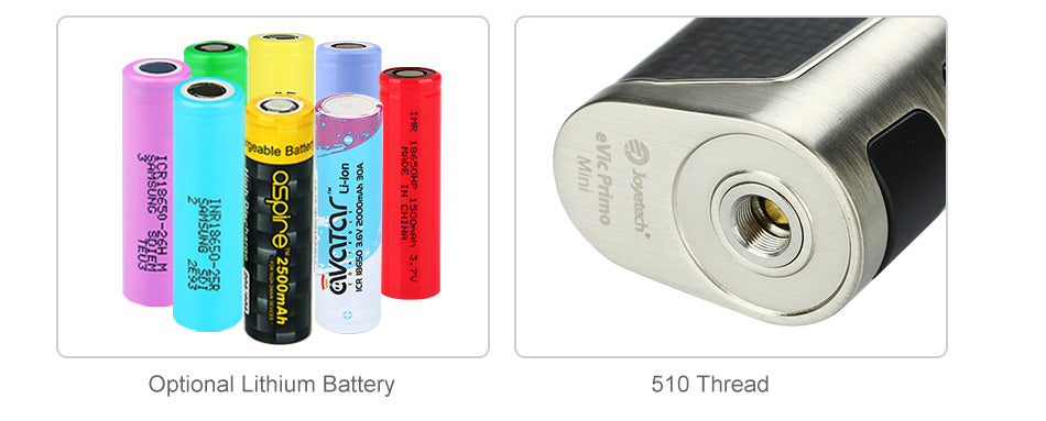 Joyetech eVic Primo Mini 80W Batterie Mod Akkuträger wird von einer einzigen 18650 Akkuträger mit hohem Durchsatz angetrieben und die maximale Leistung kann bis zu 80W erreicht werden, um Ihnen ein fantastische Dampfen Erlebnis zu bieten, welches einen großen 1,3 Zoll OLED Bildschirm anwendet. Verglichen mit dem EVIC Primo Mod Akkuträger, bietet der EVIC Primo Mini Box Mod Akkuträger die gleiche Eleganz und Zuverlässigkeit, ist aber kleiner und bietet eine maximale Ladezeit von maximal 2,0A. Joyetech eVic Primo Mini kommt mit der neuesten Firmware, Echtzeituhr, Vorheizen, benutzerdefiniertem Logo und Reverse - Lade, um das Kit sehr leistungsfähig zu machen. Und es gibt 5 Farben, um Ihr Dampfen-Erlebnis bunt zu machen.