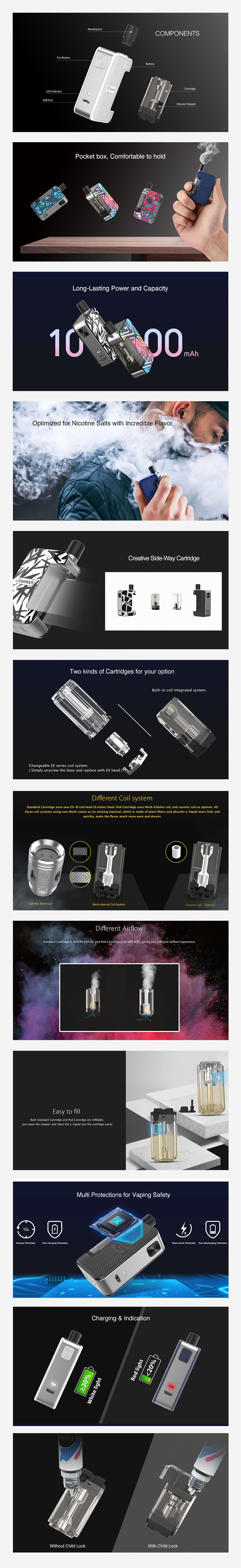 Joyetech Exceed Grip Kit ist eine aktualisierte Version von Joyetech Exceed. Der Joyetech Exceed Grip Akkuträger, der mit einer eingebauten 1000-mAh-Batterie ausgestattet ist, bietet langlebige und stabile Dampferfahrung mit maximal 20 W Leistung. Darüber hinaus bietet es auch einen intelligenten, variablen Spannungsausgang. Mit dem innovativen Trockenbrennschutz ist der Exceed Grip sicher in der Anwendung. Das Exceed Grip Kit verfügt über zwei Arten von Exceed Grip-Kartuschen, darunter eine 4,5-ml-Standardkartusche mit vorinstallierter 0,4-Ohm-EX-M Coil und eine 3,5 ml Kartusche mit integrierter 0,8 Ohm Mattenspule. Das Joyetech Exceed Grip Kit kann Ihnen wirklich unterschiedliche Dampferfahrungen bieten.