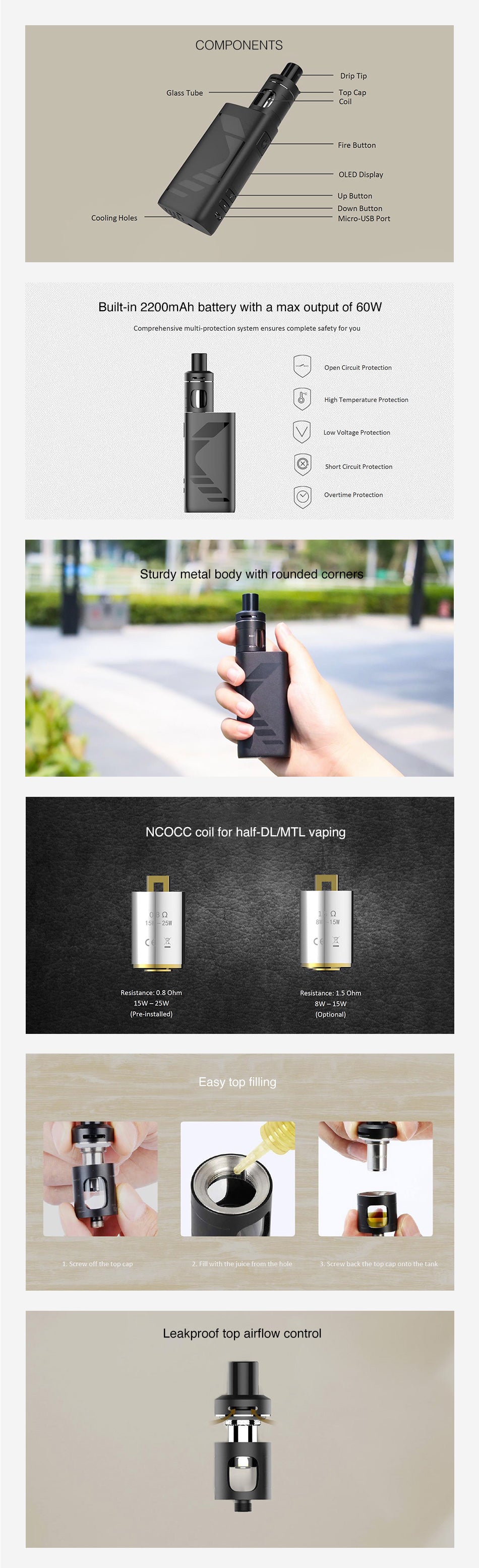 Das Kangertech Subox Mini V2 Starterset ist ein neu entwickeltes Starter Kit aus der Kangertech-Familie. Es besteht hauptsächlich aus der neuen 2200 mAh Kbox Mini 2.0 60W MOD und einem 2ml Subtank Mini 2.0 Verdampfer. Der Kbox Mini 2.0 Akkuträger verfügt außerdem über ein umfassendes Mehrfachschutzsystem, das Ihnen vollständige Sicherheit bietet. Der neueste Kangertech Subtank Mini 2.0 Verdampfer verfügt über 2 ml iquid Kapazität und ist einfach zu befüllen. Mit der einzigartigen vormontierten 0,8Ohm NCOCC Spule für Half-DL-Dampfen und der optionalen 1,5 Ohm NCOCC Spule für MTL-Dampfen bietet der Subtank Mini 2.0 Tank ein unverwechselbares Verdampfen-Erlebnis.