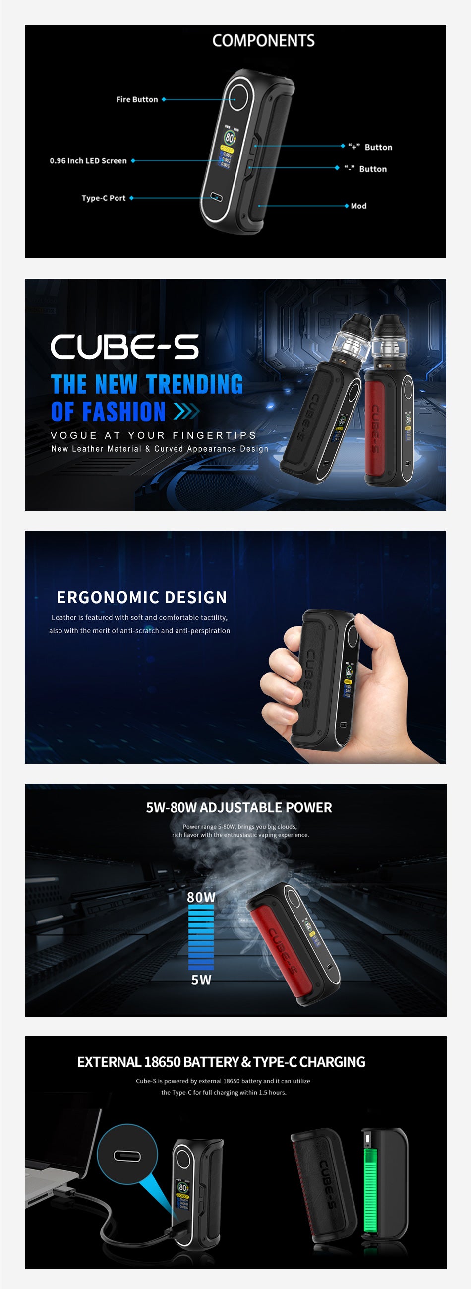 Der OBS Cube-S VW Box Akkuträger hat die ultimative Verwendung und Verarbeitung von Leder erreicht und wird aus neuem Ledermaterial hergestellt, was es kratzfest und schweißhemmend macht. Der OBS Cube-S wird von einer einzelnen 18650 Batterie mit einer maximalen Leistung von 80 W angetrieben. Der OBS Cube-S VW-Box MOD Akkuträger verfügt auch über eine Leistungsanpassungsfunktion, und der Benutzer kann den Einstellbereich von 5 W bis 80 W auswählen. Mit dem zusätzlichen Design des LED-Bildschirms und dem Aufladen vom Typ C wird der OBS Cube-S MOD ein phänomenales Dampfgerät sein.