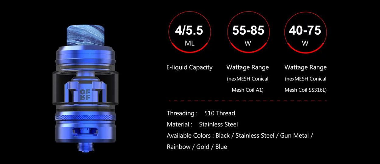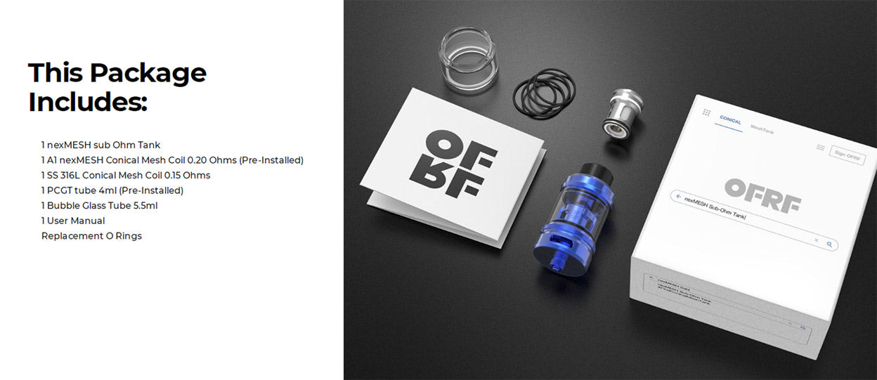 OFRF NexMESH Sub Ohm Tank ist der erste konischmaschige Spulentank, der mit nexMESH Coil betrieben wird. Es bewaffnet sich mit einem Fassungsvermögen von 4 ml, das zum längeren Dämpfen zur Verfügung steht. OFRF nexMesh Sub Ohm Tank ist gepaart mit zwei Mesh Coils, einschließlich 0.2 Ohm nexMESH A1 Conical Mesh Coil und 0,15 Ohm nexMESH SS 316L Conical Mesh Coil, die sich perfekt für temperaturgesteuertes Dämpfen eignen. Die Coils hat ein doppeltes Baumwolldesign, das den Geschmack auf ein neues Niveau hebt. Darüber hinaus zeigt Ihnen das duale Dampfkomprimierungssystem einen intensiveren und frischeren Geschmack, den Sie zuvor noch nicht erlebt haben. Sie würden sich auch wegen des Top Füllungsdesigns und der Verhinderung des Ölleckwiderstands wohl fühlen.