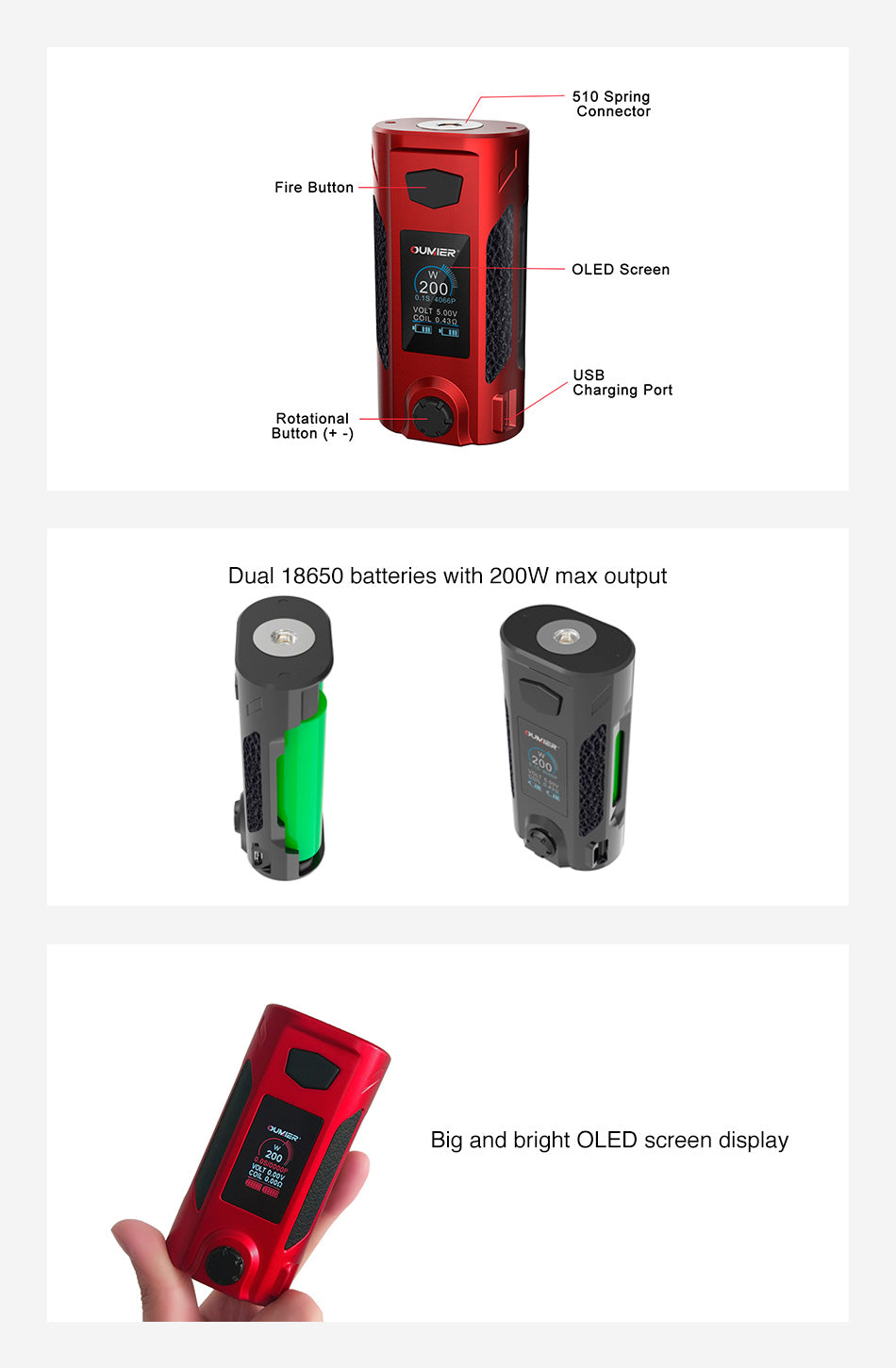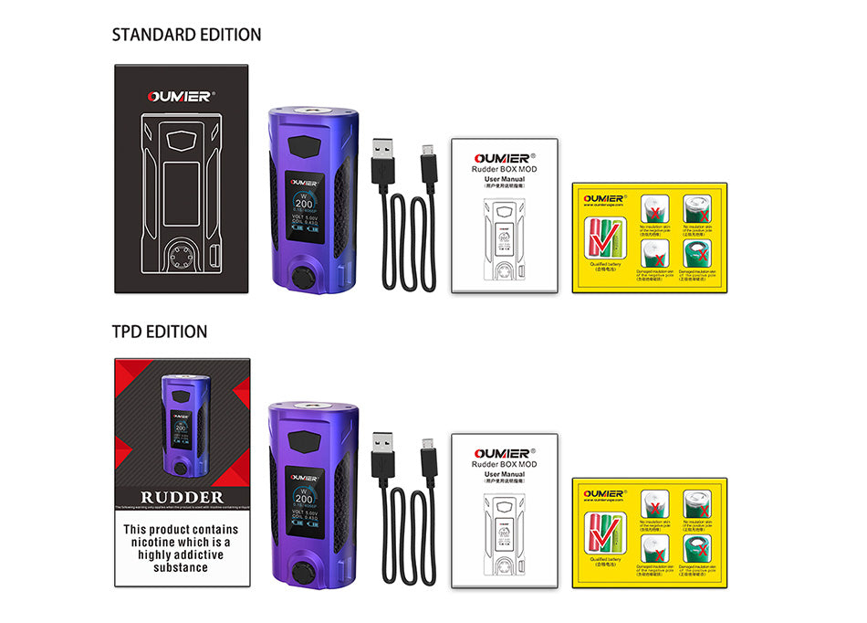 OUMIER Rudder MOD ist ein kompaktes und leistungsstarkes MOD mit hellem und großem OLED-Bildschirm und innovativem Drehwahltaster. Die Rudder Box Akkuträger wird von zwei 18650-Batterien und der maximalen Ausgangsleistung von 200 W mit verschiedenen Arbeitsmodi gespeist und ist für RTA / RDA / RDTA mit 510 Anschluss geeignet. Der Akkuträger unterstützt 4 Modi: VW / NI / TI / SS.