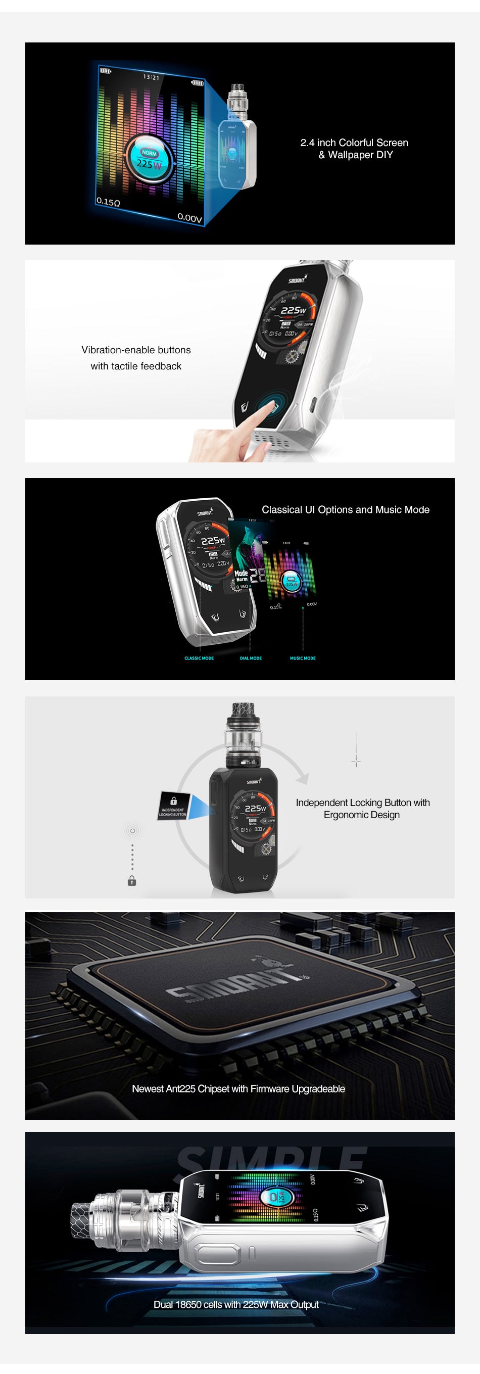 SMOANT NABOO 225W TC-Box-Mod ist der erste 2,4Zoll bunte Bildschirm der Welt, der größere Bildschirm bietet Ihnen mehr Details. Auf dem Bildschirm befindet sich eine Berührungsschaltfläche, die ein taktiles Feedback liefert, das Sie von den High Tech Geräten erwarten. Der Akku wird von zwei 18650 Batterien betrieben, und die maximale Leistung kann bis zu 225 W betragen. Ausgestattet mit dem Ant225 Chip kann der SMOANT NABOO Mod in 0,015 Sekunden abfeuern und ein Bild herunterladen, das der Benutzer zum Anpassen des Hintergrundbildes und des Standby Bildschirms mag. Smoant Naboo 225W Box Mod stellt eine anpassbare Benutzeroberfläche mit drei verschiedenen Modi bereit: Classic, Dial und Music Mode. Dank des integrierten Ant225 Chipsets erreicht der NABOO eine schnelle Schussgeschwindigkeit von 0,015 Sekunden. Die umfangreiche Temperatursteuerungssuite kann verwendet werden, um den Dampfstil an den Benutzer anzupassen und kann den Widerstand an bestimmte Zusammensetzungen von Heizelementen und Drähten anpassen. Darüber hinaus verfügt das Smoant Naboo 225W Starter Kit über taktile Berührungsknöpfe für intuitive Einstellungen, einen unabhängigen Sperrknopf, um ein versehentliches Feuer zu verhindern, sowie einen großen Abfeuerungsknopf.