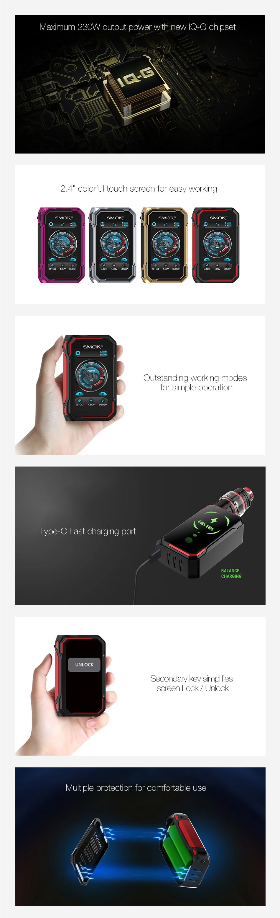 Smok G-PRIV 3 Box Akkuträger , ein umfassendes Upgrade der Software- und Hardware-Box Akkuträger, wird mit zwei 18650-Batterien in Serie mit einer maximalen Leistung von 230W betrieben. Angetrieben von einem neuen intelligenten IQ-G-Chipsatz, bietet es eine brandneue Benutzeroberfläche und Benutzererfahrungen. Die Rückseite des G-PRIV 3 Akkuträgers ist mit einer Acrylschalenstruktur mit sanfter und glatter Textur versehen, deren lebendige Farben den gesamten Akkuträger trendiger und moderner wirken lassen. Die G-PRIV 3 Box Akkuträger mit einem 2,4 Zoll großen Touchscreen, der sehr reaktionsschnell ist, können die meisten Operationen mit einer einfachen Berührung beendet werden. Für die Bildschirmeinstellungen stehen 6 Themenfarben zur Verfügung. Der G-PRIV 3 Box Akkuträger mit dem Sekundärschlüssel zum Sperren und Entsperren des Touchscreens, mit der unabhängigen Taste können Sie den Bildschirm einfach sperren/entsperren. Mit dem USB-Schnellladesystem vom Typ C, das eine Superschnellladung unterstützt, sind die Akkus in kurzer Zeit vollständig aufgeladen. Darüber hinaus bietet es mehrere Schutzarten, um potenzielle Risiken zu vermeiden.