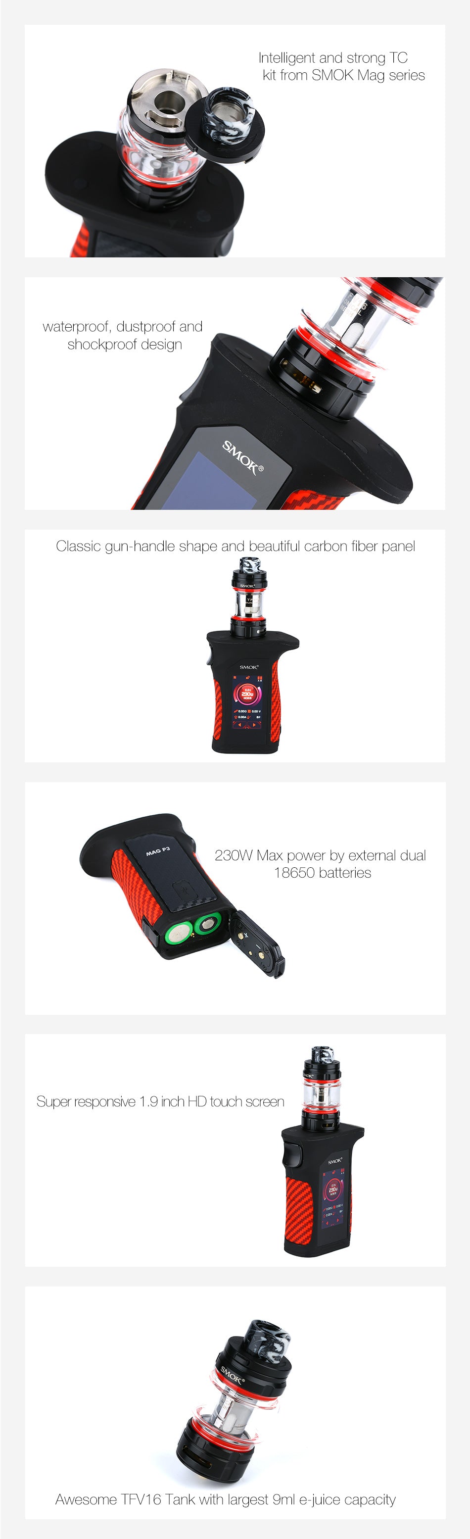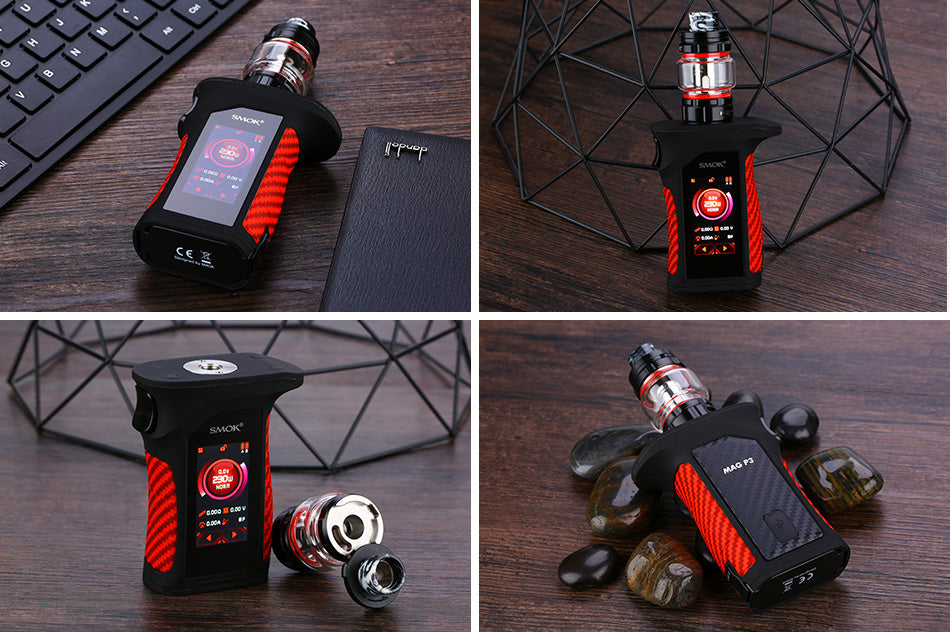 Das SMOK MAG P3 Kit setzt die klassische MAG Serie fort und bietet noch mehr atemberaubende Funktionen, wie z. B. Wasserdichtigkeit, Staubdichtigkeit und Stoßfestigkeit. Mit dem bekannten Pistolengriff Formfaktor verzichtet das neue P3 Kit zugunsten einer neuen Flügeltür auf das magazinartige Batteriefach, um dem neuen wasserdichten Design gerecht zu werden. Das MAG P3 Kit wird mit zwei 18650 Batterien und einem intelligenten IQ S Chipsatz betrieben und kann mit einer Blitzgeschwindigkeit von 0,001s eine maximale Ausgangsleistung von 230W abfeuern. Es verfügt über einen superresponsiven 1,9Zoll HD Touchscreen, der nützliche Dateninformationen für eine einfachere Bedienung bietet. MAG P3 nimmt immer noch den exquisiten kleinen Feuerschlüssel an, mit dem Sie sich wohl fühlen, wenn Sie den Knopf berühren und drücken. Der TFV16 Tank verfügt über die größte E-Saft Kapazität von 9ml und ist mit einer neuen 0,2Ohm Spule aus konischem Netz TFV16 mit nexMesh Technologie vorinstalliert. Mit dem Verriegelungsdruckknopf an der oberen Kappe kann das Auslaufen von E-Saft verhindert werden, wenn die obere Kappe versehentlich geöffnet wird. Darüber hinaus wird eine Eingabetastatur mitgeliefert, die einen Kennwortschutz zum Entsperren des Geräts bietet. Es bietet mehrere Schutzfunktionen, um die Sicherheit der Dämpfe zu gewährleisten.