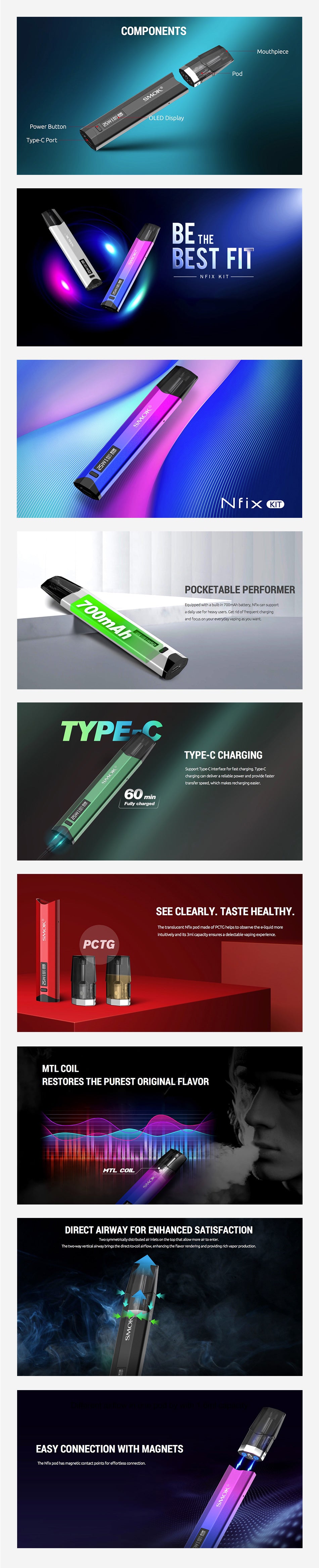 Das SMOK Nfix 25W VW Pod Kit ist eine perfekte Präsenz von geringer Größe und leistungsstarker Funktion. Das SMOK Nfix 25W Pod Kit wird von einem eingebauten 700-mAh-Akku mit einer Leistung von bis zu 25 W betrieben. Die Spule in SMOK Nfix Pod ist eine Doppelspulenstruktur, die den Benutzern viel Geschmack verleiht. Es ist so leicht, dass es bequem in der Hand gehalten werden kann. Mit zwei symmetrisch verteilten Lufteinlässen oben kann mehr Luft eindringen, wodurch der Luftstrom direkt zur Spule geleitet, die Geschmackswiedergabe verbessert und eine reichhaltige Dampfproduktion erzielt wird. Es gibt einen Magneten für die einfache Verbindung.