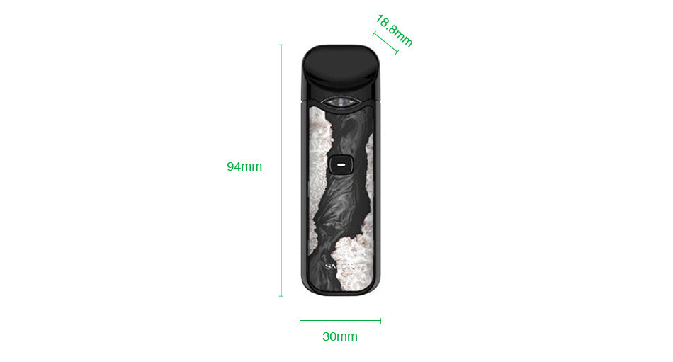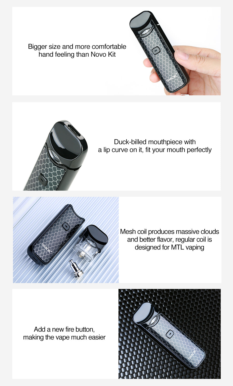 Das SMOK Nord Vape Pod Vape Starter Kit ist die fortschrittliche Version von Novo, die mit einem 1100-mAh-Akku betrieben wird, der zwei mal größer als Novo's. Es fügte einen Feuerknopf hinzu, um das Dampfen zu beginnen, und es dient auch als LED-Anzeige, um die Akkulaufzeit anzuzeigen. Die größere und dickere Größe macht es bequemer in der Hand zu halten. Das verbesserte Entenschnabel-Mundstück ist mit einer Lippenkurve versehen, es passt perfekt zu Ihrem Mund und bietet ein besseres Erlebnis. Die Pod-Patrone kann 3ml E-Saft aufnehmen. Darüber hinaus enthielt das Paket zwei Spulen: Nord 0,6 Ω-Maschenspule und 1,4 Ω-Normalspule. Die 0,6-Ohm-Netzspule ist für das Sub-Ohm-Dampfen konzipiert und bietet schnellere Erwärmung und massive Wolken. Die 1,4-Ohm-Regelspule ist für das Verdampfen von MTL ausgelegt.