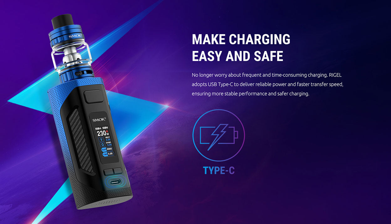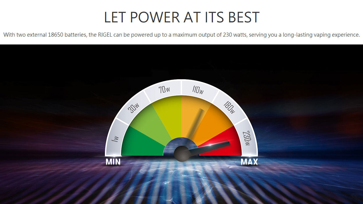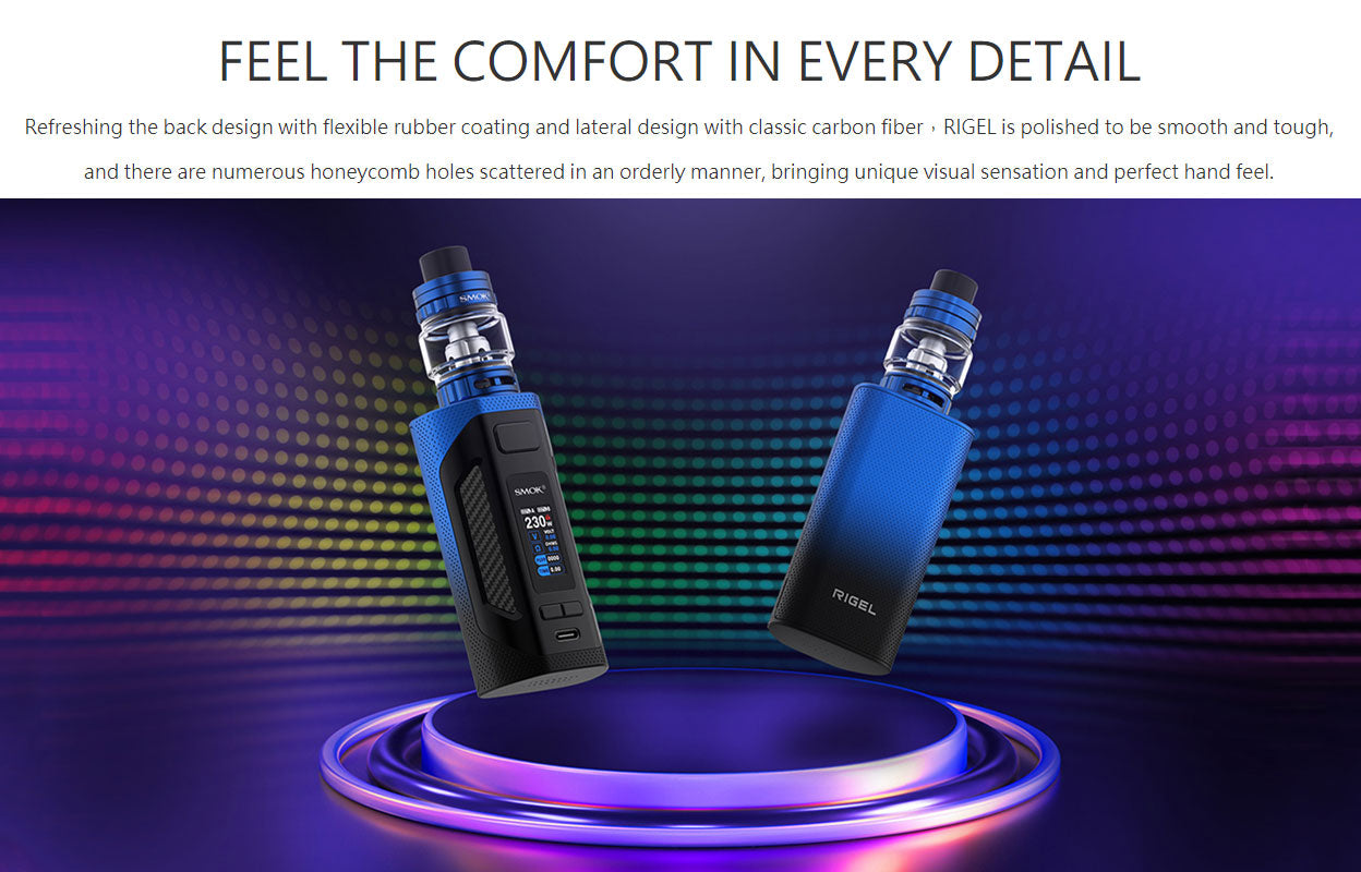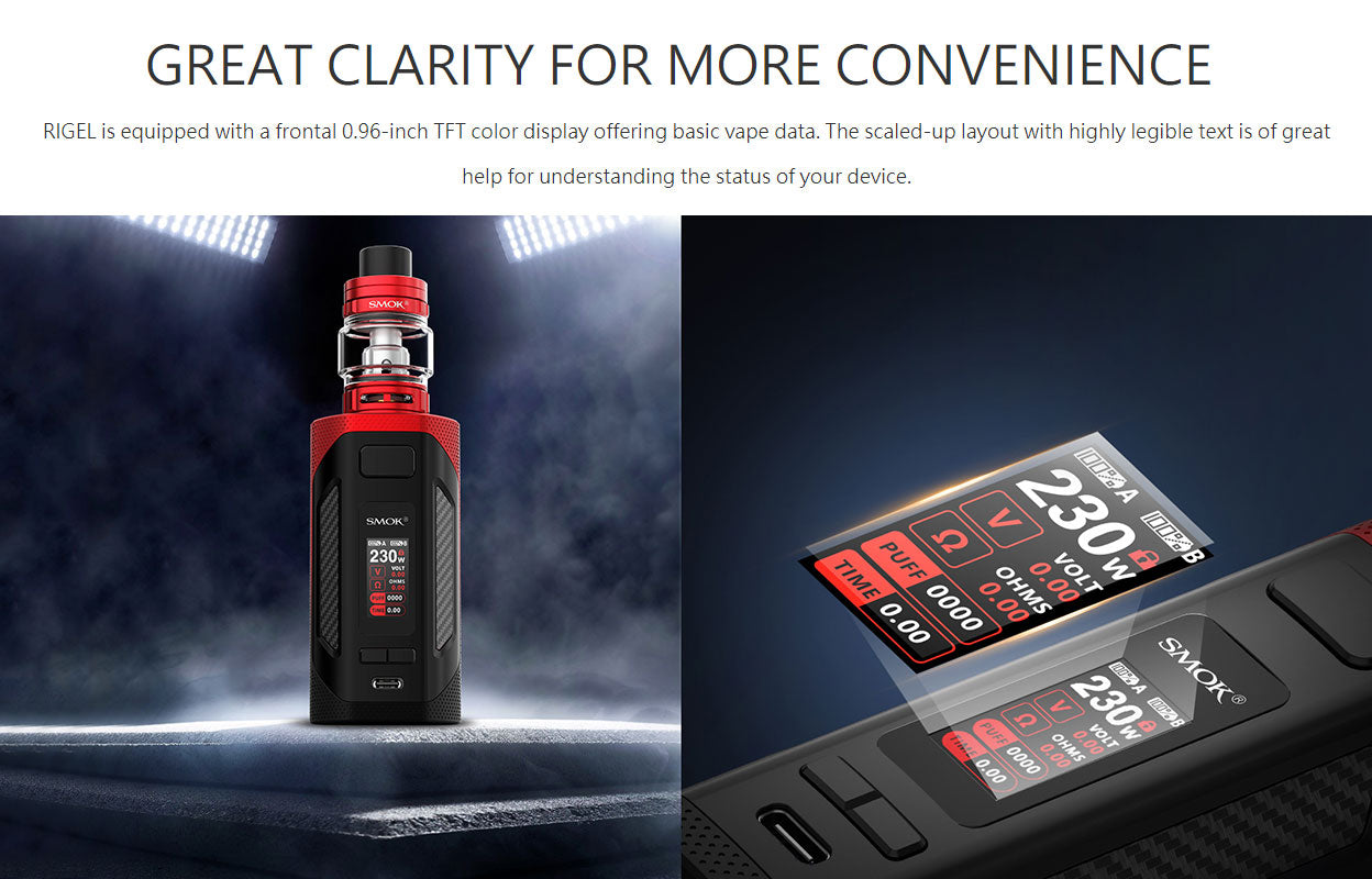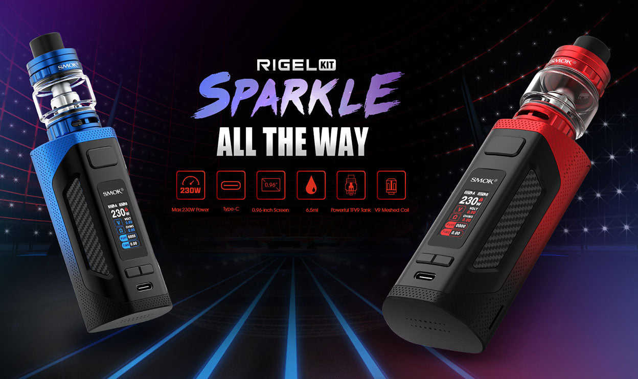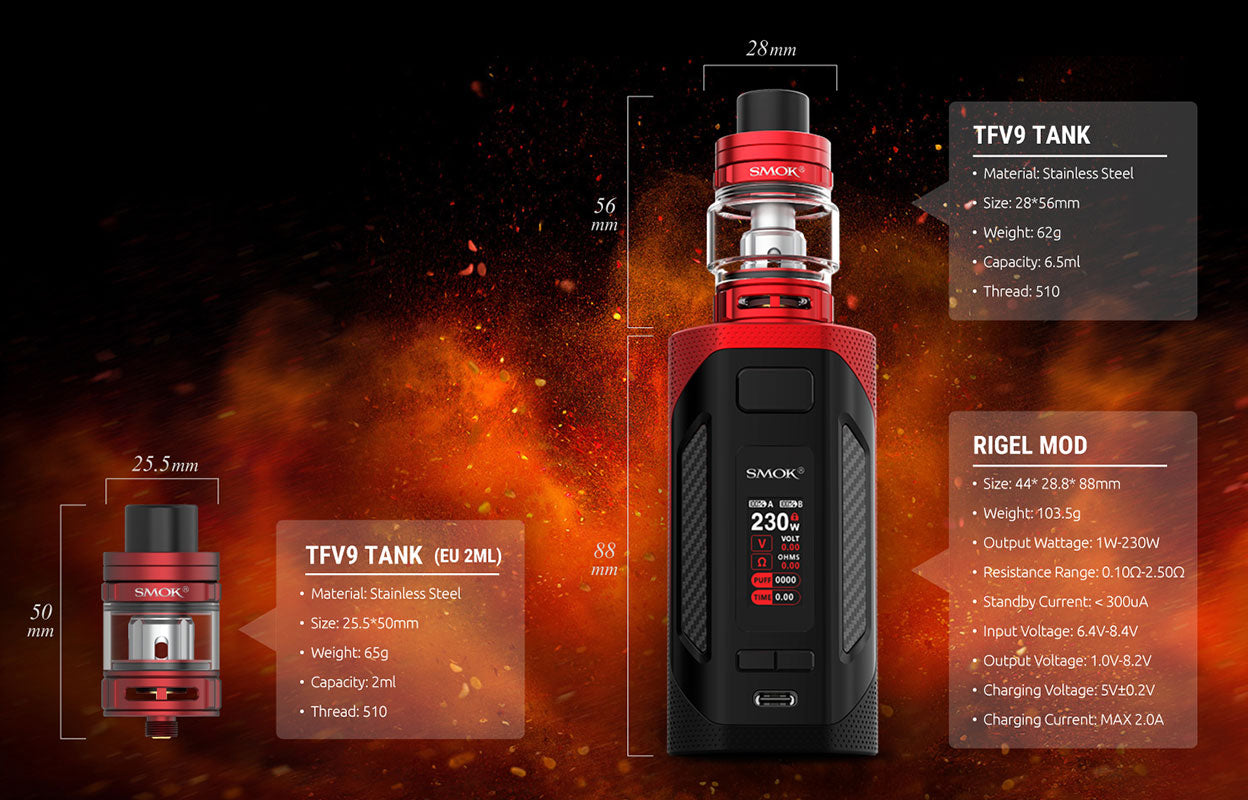 Das SMOK Rigel 230W Starter Kit besteht aus SMOK Rigel Mod und TFV9 Tank. Das Kit wird von zwei 18650-Hochleistungsbatterien mit einer maximalen Leistung von 230 W betrieben. Das 0,96-Zoll-TFT-Display zeigt Ihnen die Dampfdaten deutlich an. Sie können die Arbeitsleistung von 1 W auf 230 W einstellen, indem Sie die Einstelltasten frei drücken. Der SMOK TFV9 Tank wurde für den Durchbruch des Geschmacks entwickelt. Es kann 6,5 ml Vapussaft aufnehmen, und die kindersichere obere Abdeckung verhindert das versehentliche Öffnen und Austreten von Saft. Der TFV9 Tank verfügt über ein Slide-to-Fill-System, mit dem das einfache und sichere Befüllen von iquid realisiert werden kann. Mit einer einzigen Einfüllöffnung und einer auslaufsicheren Nut kann das Leckageproblem perfekt gelöst werden. Im Inneren des Tanks befindet sich eine 0,9 ohm V9 Coil aus Kanthal, die riesige Wolken und einen guten Geschmack erzeugen kann. Es gibt zwei große einstellbare Schlitze für den Luftstrom an der Basis, und der Lufteinlass kann einfach durch Drehen des AFC-Rings eingestellt werden.