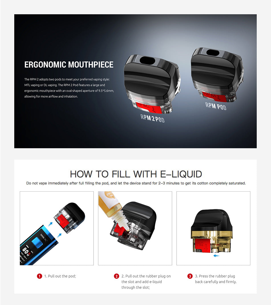 Die SMOK RPM 2 Pod Cartridge wurde speziell für das SMOK RPM 2 Kit entwickelt. Der leere SMOK RPM 2-Pod enthält zwei Typen: RPM 2 RPM 2 Pod und RPM 2 RPM Pod zur Unterstützung von DL-und MTL-Verdampfen. Die SMOK RPM 2 Cartridge verfügt über eine iquid-Kapazität von 7 ml mit sichtbarem iquid-Fenster und seitlichem Füllungsdesign. Sie verfügt außerdem über ein großes und ergonomisches Mundstück mit einer ovalen Öffnung von 9,5*5,6 mm, das mehr Luftstrom und Inhalation ermöglicht.