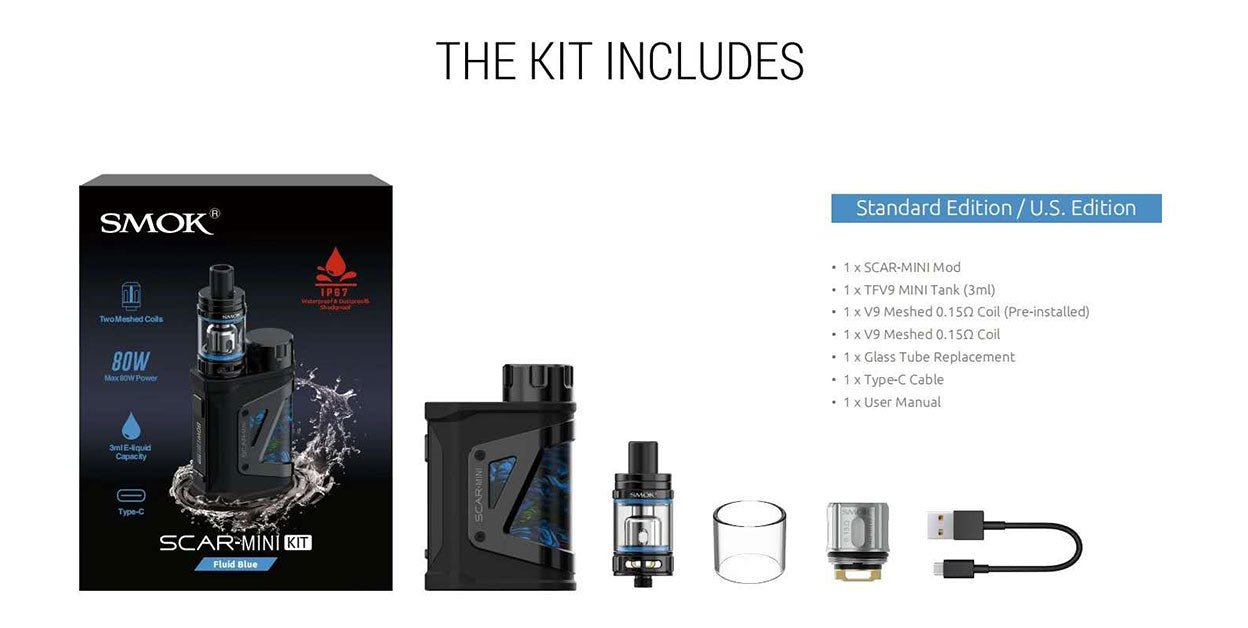 Das SMOK Scar-Mini Kit ist eine tragbare Mini-Version seines Vorgängers Scar-18 und wurde auf dieser Basis unter Berücksichtigung exzellenter Funktionen und hochwertigen Designs optimiert und innoviert. Der SMOK Scar-Mini Box Mod Akkuträger ist mit einem oberen Batterieeinschub ausgestattet, und betrieben mit einer einzelnen 18650 Batterie mit einstellbarer Leistung von 1-80W. Der SMOK Scar-Mini 80W Box Mod Akkuträger verfügt über IP67, ist wasserdicht, staubdicht und stoßdicht. Und der 0,69-Zoll OLED-Bildschirm kann detaillierte Vape-Daten in Echtzeit anzeigen. Der SMOK TFV9 Mini Tank Verdampfer verwendet ein neu gestaltetes Luftstromsystem, das durch Drehen des Luftstromrings eingestellt werden kann. Mit dem kindersicheren, aufklappbaren Deckel kann der TFV9 Mini Sub Ohm Verdampfer versehentliches Öffnen und Auslaufen verhindern. Der SMOK TFV9 Mini Verdampfer hat ein Fassungsvermögen von 3 ml mit Top-Füllung und eine V9 Meshed 0,15 Ohm Kanthal Coil für starke Leistung und riesige Dämpfe.