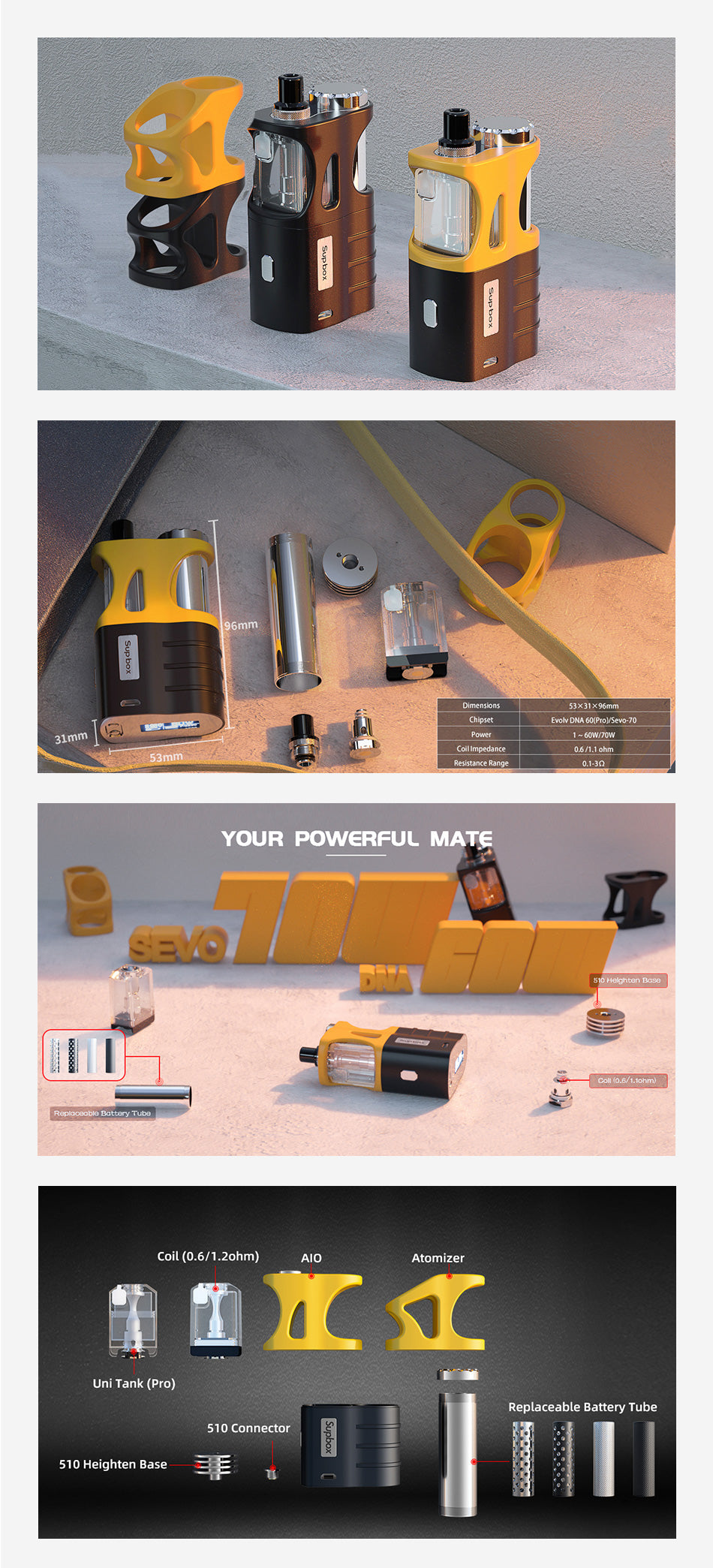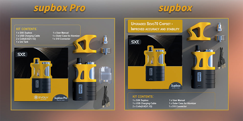 Das SXK Supbox Sevo 70W Box Kit enthält die Supbox Cartridge, die mit mehr als 90% des Originalzubehörs des Billet Box Pod Kits kompatibel ist. Es verfügt auch über die Supbox 0,6/1,1 Ω Coil(Mesh), die mit SMOK RPM Coil kompatibel ist. Es kann in 5 verschiedene Formen gewechselt werden: Pod Modus, Tank/RDA Modus, Universal Modus, 18650 Modus, 18350 Modus.