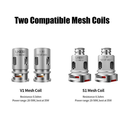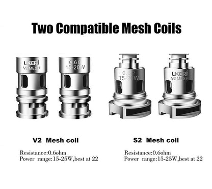 Ukeri Mesh Coil gilt für Brave Kit und Magik Kit. Es gibt 4 Typen für Ihre Option: V1 Mesh Coil, V2 Mesh Coil, S1 Mesh Coil und S2 Mesh Coil. Sowohl die V1 Mesh Coil als auch die S1 Mesh Coil haben einen Widerstand von 0,3 Ohm, am besten bei 35W. Die anderen beiden Typen haben einen Widerstand von 0,6 Ohm, am besten bei 22W. Jede Packung enthält 5 Stück.