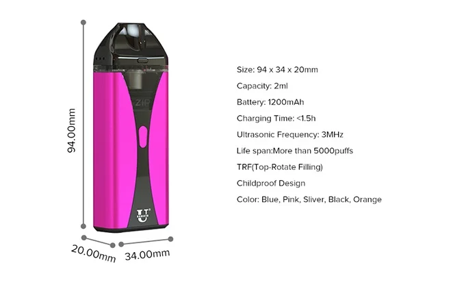 Das Usonicig Zip Pod Starter Kit ist ein neues vape Kit mit 2-in-1 Pod! Sie können damit sowohl Nic Salt. Keine Coil, nie verbrannt, Sie versichern Ihnen einfach einen intensiven und originellen Geschmack von Flüssigkeiten und ermöglichen Ihnen eine entspannte Dampffunktion. Das wichtigste ist, dass ZIP einen guten Ruf für sein bestes Aroma mit NK Salzen und eine höhere Bioverfügbarkeit hat. Das Top-Rotate Filling (TRF) System macht das Nachfüllen auch einfacher als zuvor. Der Usonicig Zip Pod ist außerdem mit einem kindersicheren Mechanismus und verschiedenen Batterieprotektoren ausgestattet.