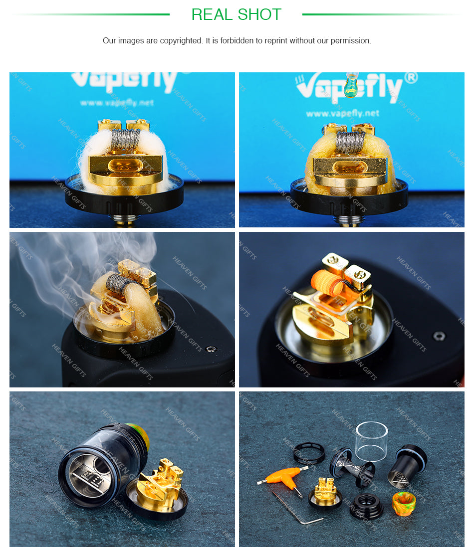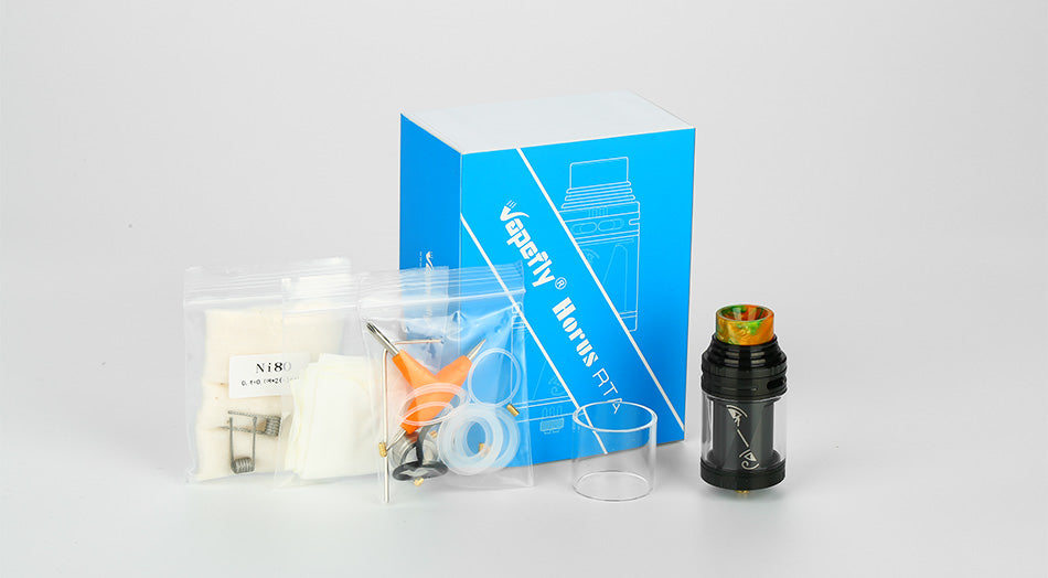 Sag hallo zu den neuesten vape RTA - Horus RTA - der von Vapefly entworfen wurde. Vapefly Horus RTA Tankzerstäuber nimmt ein ultimatives "b" Luftströmungssystem RTA mit auslaufsicherem Design in 25mm Durchmesser an. Das glatte "b" -Luftsystem sorgt für eine Airflow System, die das Coil umgibt und für vollen Geschmack und eine massive Dampfproduktion sorgt. Und das 24K Gold-beschichtete Single-Coil-Deck bietet stabiles Dampfen und ermöglicht ein einfaches Coil-Aufbauen. Außerdem unterstützt vapefly Horus durchbohrtes Design, um Hitze zu vermeiden.