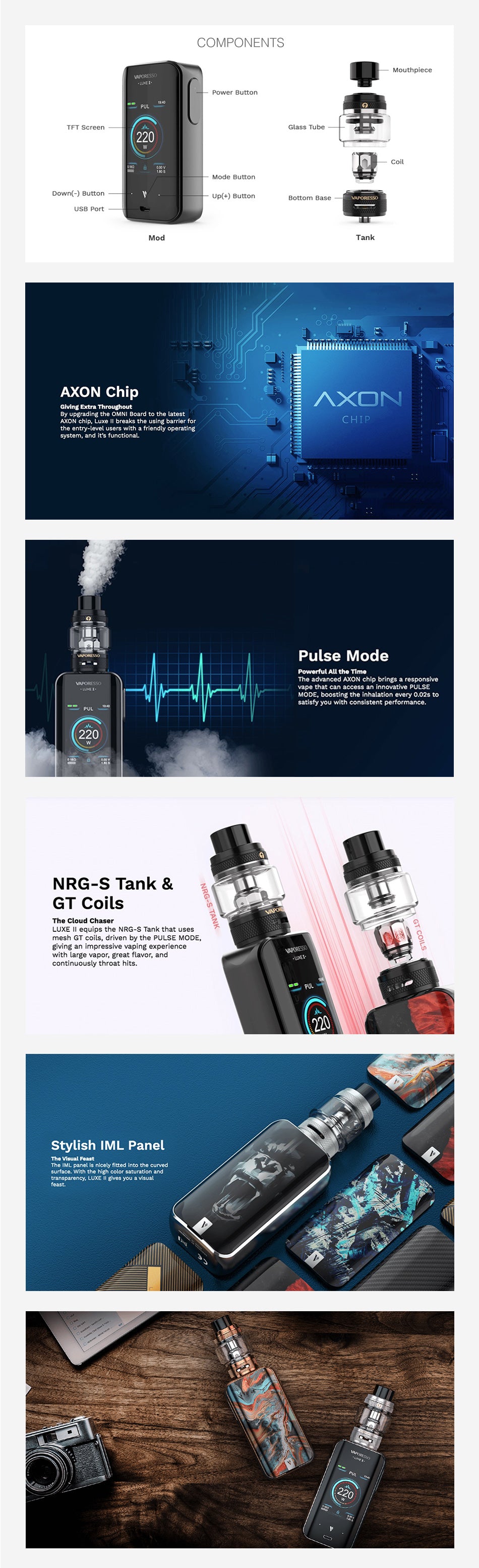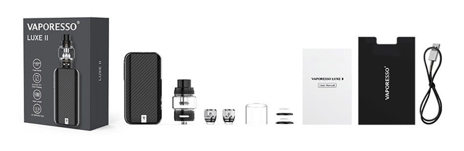 Das Vaporesso LUXE II Kit ist ein Upgrade des originalen Vaporesso LUXEs, das elegante Ästhetik mit kraftvoller Leistung kombiniert und ein unvergleichliches Luxus-Dampferlebnis bietet. Das Vaporesso LUXE II Kit besteht aus dem Vaporesso LUXE II 220W Mod Akkuträger und dem Vaporesso NRG-S Verdampfer. Es bietet eine komfortable Form und Funktionen, die die beste Leistung ausmachen. Der elegante LUXE II Box Akkuträger ist mit einer magnetischen Batterieabdeckung auf der Rückseite ausgestattet, die zwei 18650-Batterien problemlos ersetzen kann. Die Innovation des Vaporesso LUXE II Kits spiegelt sich im revolutionären AXON CHIP und der gründlich aktualisierten Benutzeroberfläche wider. Durch das Upgrade der OMNI Karte auf den neuesten AXON-Chip durchbricht Luxe II die Barrieren für Einsteiger durch ein benutzerfreundliches Betriebssystem und ist leistungsstark. Der Chipsatz verfügt über mehrere Modi, die ein ultraschnelles Laden mit 2,5A und eine sofortige Zündgeschwindigkeit ermöglichen.
