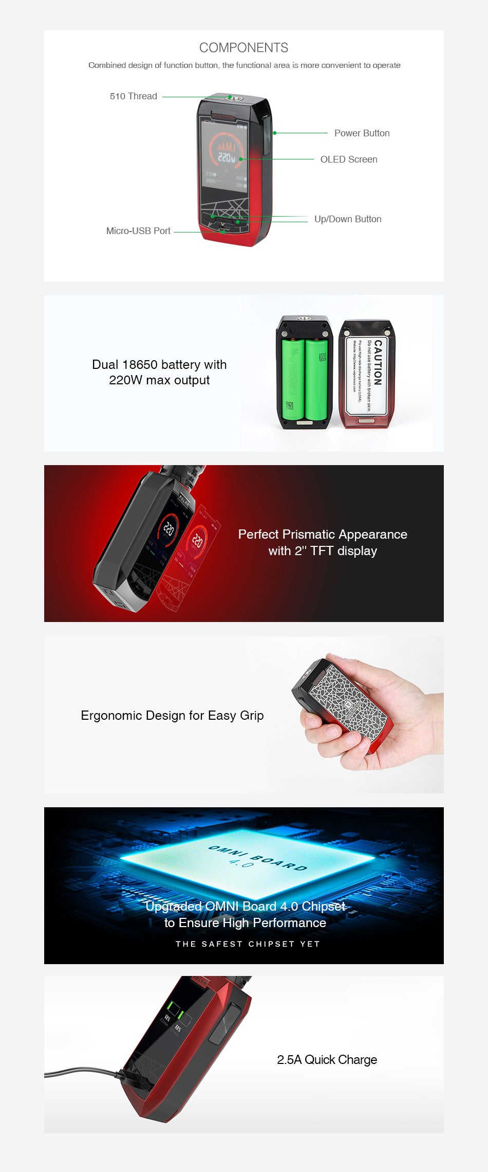 Der Vaporesso Polar 220W TC Box Akkuträger ist der perfekte und modische Look, der durch zwei 18650-Akkus und ein 2,5-A-Schnellladevorgang extrem beschleunigt werden kann. Mit der schnellsten, stabilsten und dennoch sichersten Brennrate von 0,001s erhalten Sie das schnellste und sicherste Aufheizen und den reinsten, reichsten Geschmack vom ersten Zug bis zum letzten. Außerdem verpackt Polar die Verpackung in einem schönen 2-Zoll-Farbbildschirm und verwendet das fortschrittliche OMINI Board 4.0, das den Insta-Fire-Modus, den Super-Player-Modus und mehrere Schutzfunktionen integriert. Vaporesso Polar Akkuträger für Benutzer, die eine maximale Leistung von 220 W bei minimaler Feuerverzögerung suchen.