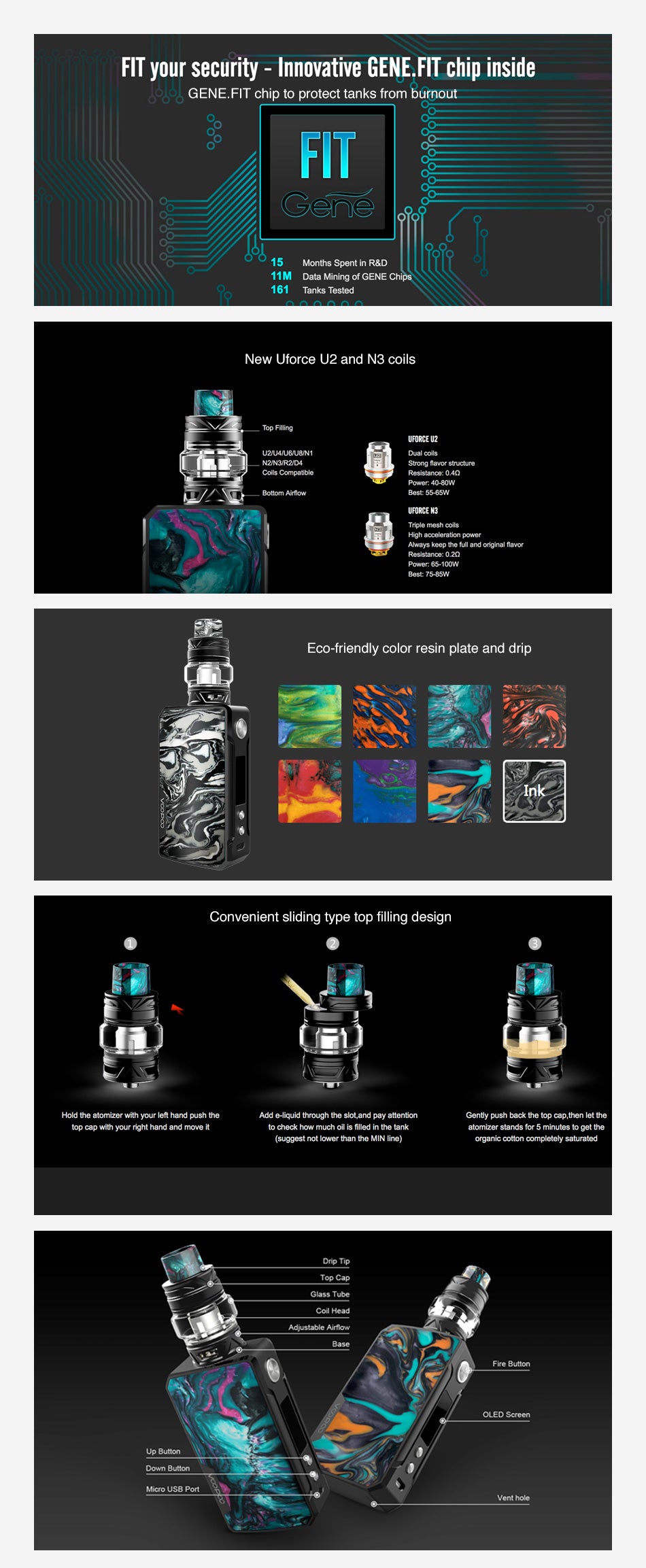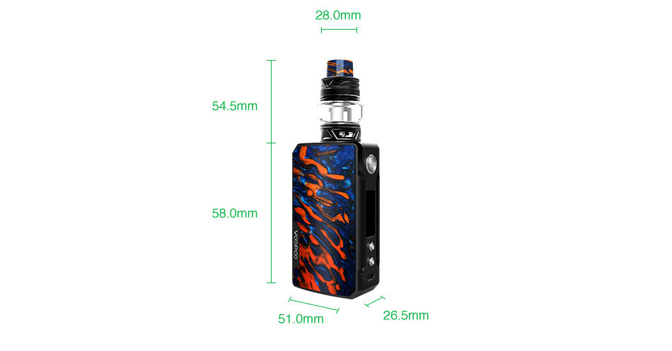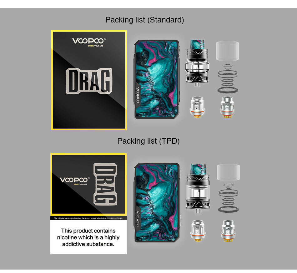 VOOPOO Drag 2 Kit ist die aktualisierte Version des originalen VOOPOO Drag Kits, welches aus dem Drag 2 Box Akkuträger und dem brandneuen Uforce T2 Verdampfer besteht. VOOPOO Drag V2 Kit verfügt über eine kompakte Maße und glattes Design, das von Dual-High-Rate 18650 Batterien angetrieben wird und maximale Leistung bis zu 177W erreicht werden kann. Neben seinem technischen High-End-Design, das auf der einen Seite mit einem bunten Harzpaneel gestrafft ist, sieht der Akkuträger auch modern aus. Auf der Bedienfläche sehen Sie ein kristallklares OLED-Display mit einem Menü, das den aktuellen Batteriestand, den Modus, den Widerstand oder die Spannung und die Wattleistung anzeigt. Zusammen mit dem neuen Uforce T2-Verdampfer bietet das Drag 2-Kit ein besseres Dampfen-Erlebnis. Der Verdampfer nutzt neue N3-Mesh-Spule, um reineren Geschmack und stärkere Wolken zu erreichen.