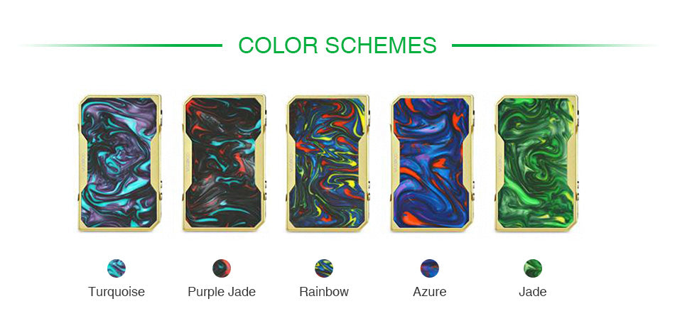 VOOPOO Gold Drag Resin Version 157W TC Box Mod Akkuträger ist eine High-End-Iteration zu einem bereits beeindruckenden Gerät. Gold Drag 157 hat den hochentwickelten 32-Bit-GENE-Chip integriert, der bis zu 157 W mit präziser Temperaturregelung und TCR-Einstellungen auslösen kann. Der integrierte Chipsatz ist Firmware-upgradefähig, mit Anpassungsfunktionen in der APP-Verbindung. Darüber hinaus hat das DRAG eine sofortige Feuergeschwindigkeit von ungefähr 0,025 Sekunden, wenn der taktile Feuerknopf gedrückt wird. Die Resin Edition VOOPOO DRAG ist aus umweltfreundlichem Kunstharz hergestellt, das mit modischem Aussehen und einzigartigem psychedelischen Muster geschmeidiger, langlebiger und bequemer ist. Holen Sie sich einen DRAG MOD für den täglichen Gebrauch!