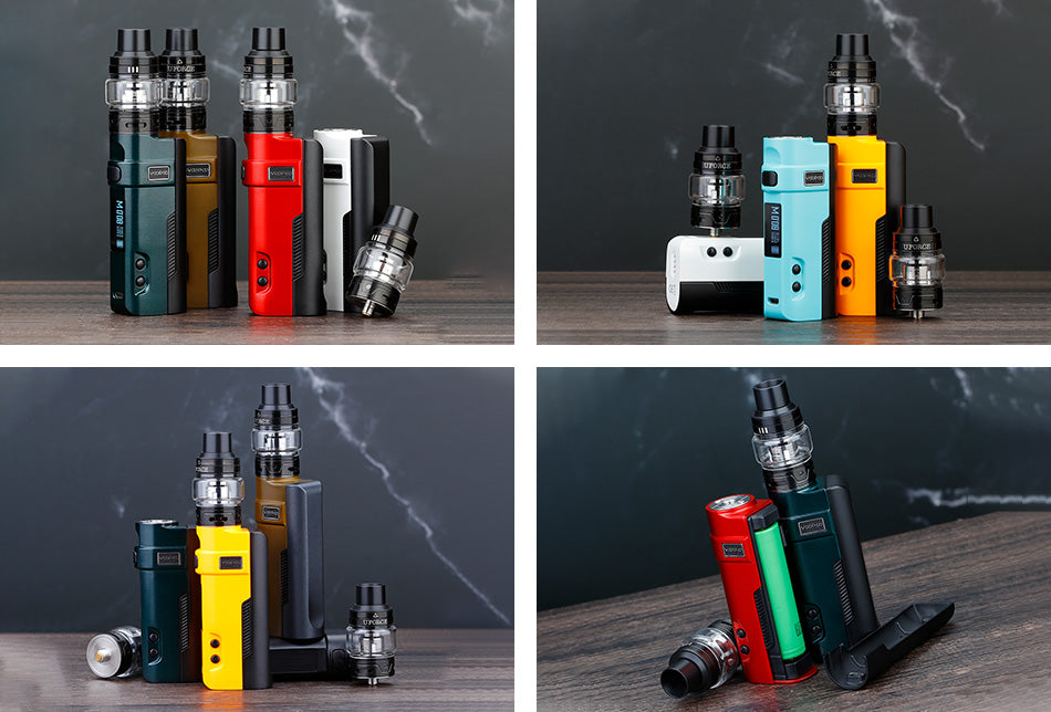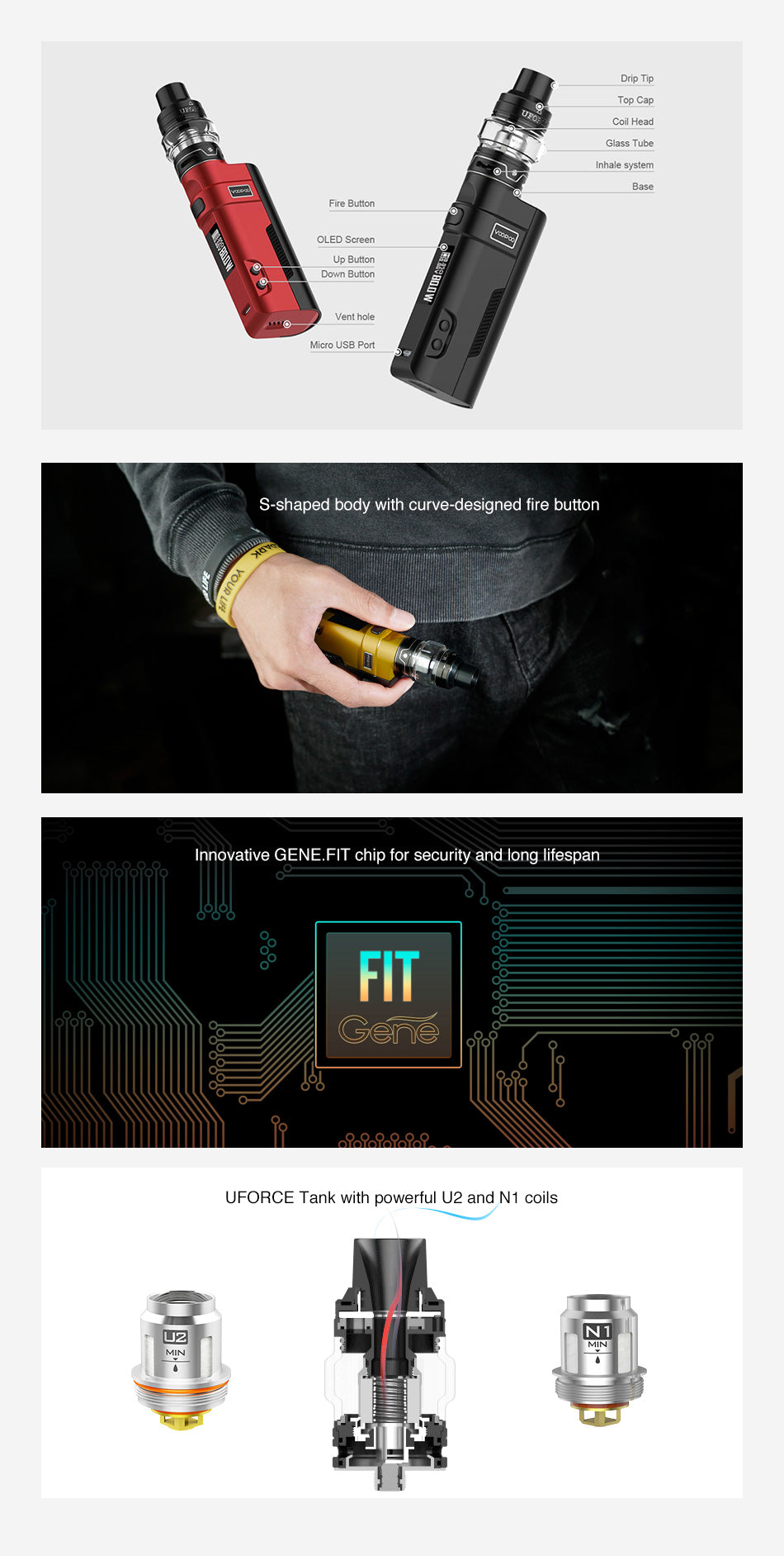 Das VOOPOO REX Kit zeichnet sich durch ein ergonomisches Design und einen S-förmigen Körper mit einem kurvenförmigen Feuerknopf aus, der sich perfekt in die Tiefe des manuellen Griffs einfügt. Der magnetische Batterieraum und die vierte Generation der 510er-Generation sorgen für Sicherheit und keine elektrische Leckage. Ausgestattet mit UFORCE Tank, verfügt es über 5 ml E-Juice-Kapazität, die einen starken und geschmeidigen Geschmack mitbringt, um die große Wolke ohne gebrannten Mund zu genießen. Mit dem innovativen GENE.FIT-Chip erreicht das VOOPOO REX 80W-Starter-Kit mit UFORCE-Tank eine extrem schnelle Schussgeschwindigkeit und kann Staub, Flüssigkeit oder Burnout blockieren. Mit nur einer Batterie betrieben, kann er eine maximale Leistung von 80 W auslösen. UFORCE Sub OhmTank verwendet die UFORCE N1 0,13 Ohm und die UFORCE U2 0,4 Ohm Doppelspule, beide mit Nennleistungen von 50 bis 100 W und dem besten Bereich von 70 bis 80 W. Der UFORCE-Tank eignet sich für das Füllen von oben und unten, und das untere Luftstromsystem ist einfach zu befüllen.