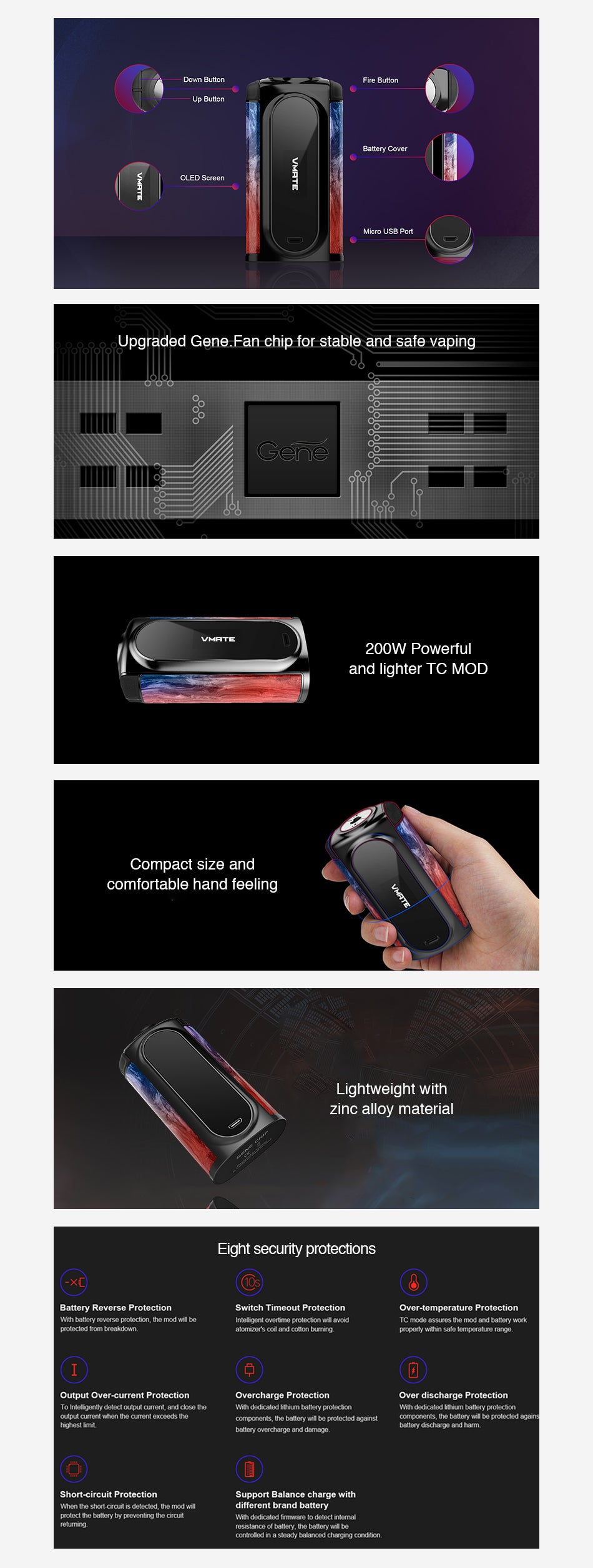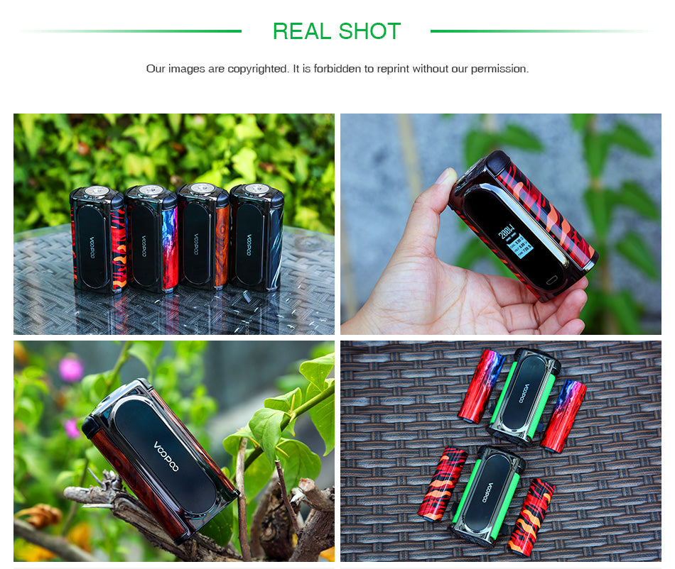 VOOPOO VMATE 200W TC Box Mod ist der brandneue Vape Box Mod, der mit zwei 18650 Zellen betrieben wird und maximale Leistung erreicht 200W. VOOPOO ist immer das traditionelle vaping zu brechen - VMATE Mod ist das Gewicht der Dual-Batterie-Gerät neu definiert, während es aus Zink-Legierung mit einem Gewicht von nur 100g aufgebaut ist. Außerdem. VOOPOO VMATE ist von Danseuse inspiriert und folgt den Regeln von Leichtigkeit, Eleganz und Schnelligkeit. Ausgestattet mit VOOPOO aktualisiert 32-stellige GENE. Fan-Chipset innen, VOOPOO VMATE bietet sichere Vaping-Erfahrung für Sie sowie wight Sicherheitsschutz. Darüber hinaus bietet VOOPOO Vmate Mod ein kompaktes schlankes Design, das OLED auf dem Mod ist das Auge des Tänzers. Es gibt einige Harzfarben für Wahl.