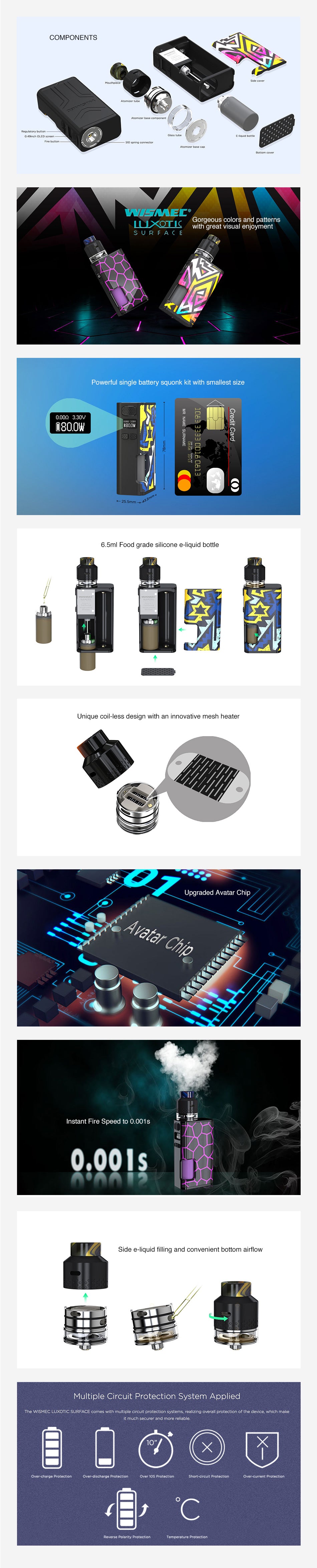 Das WISMEC Luxotic Surface-Kit ist das neue Mitglied der LUXOTIC-Serie. Es ist ein leistungsstarkes Einzel-Batterie Squonker Kit, bestehend aus 80W WISMEC Luxotic Surface Box MOD und Kestrel Tank. Der Luxotic Surface Squonk MOD wird mit einem einzigen 18650-Akku mit verbessertem Avatar-Chip betrieben und unterstützt die maximale Leistung von 80 W und bietet stabile und fortschrittliche TC / VW-Modi mit einem 0,49 Zoll OLED Bildschirm. Und die interne nachfüllbare iquid Flasche hat eine Kapazität von 6,5 ml E-Saft. Darüber hinaus bietet der Luxotic Surface Set eine schnelle und stabile Schussgeschwindigkeit von 0,001 Sekunden, um extrem starken Dampf mit bestem Geschmack zu erzeugen. Der Kestrel RDTA ist mit einem spulenlosen Design mit einer innovativen Netzheizung ausgestattet, um die Heizfläche zu vergrößern. Die gleichmäßige Erwärmung sorgt für ein wunderbares Aroma. Der Mesh Heizkörper verfügt auch über eine längere Lebensdauer von 3 Monaten. Die seitliche iquid Befüllung und die bequeme Luftstromsteuerung machen den KESTREL auch sehr attraktiv und beliebt.